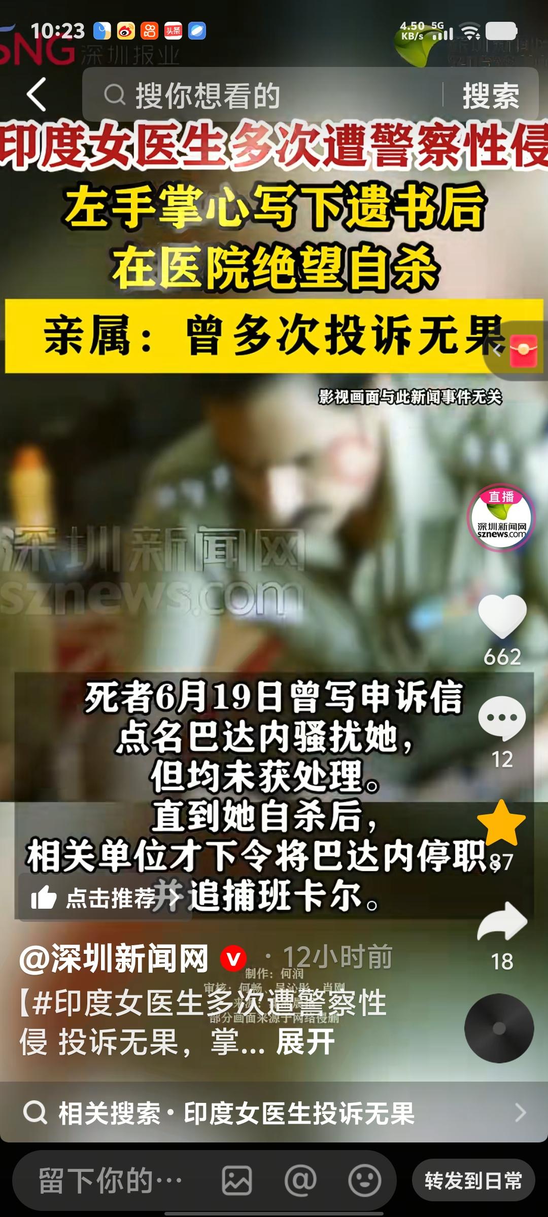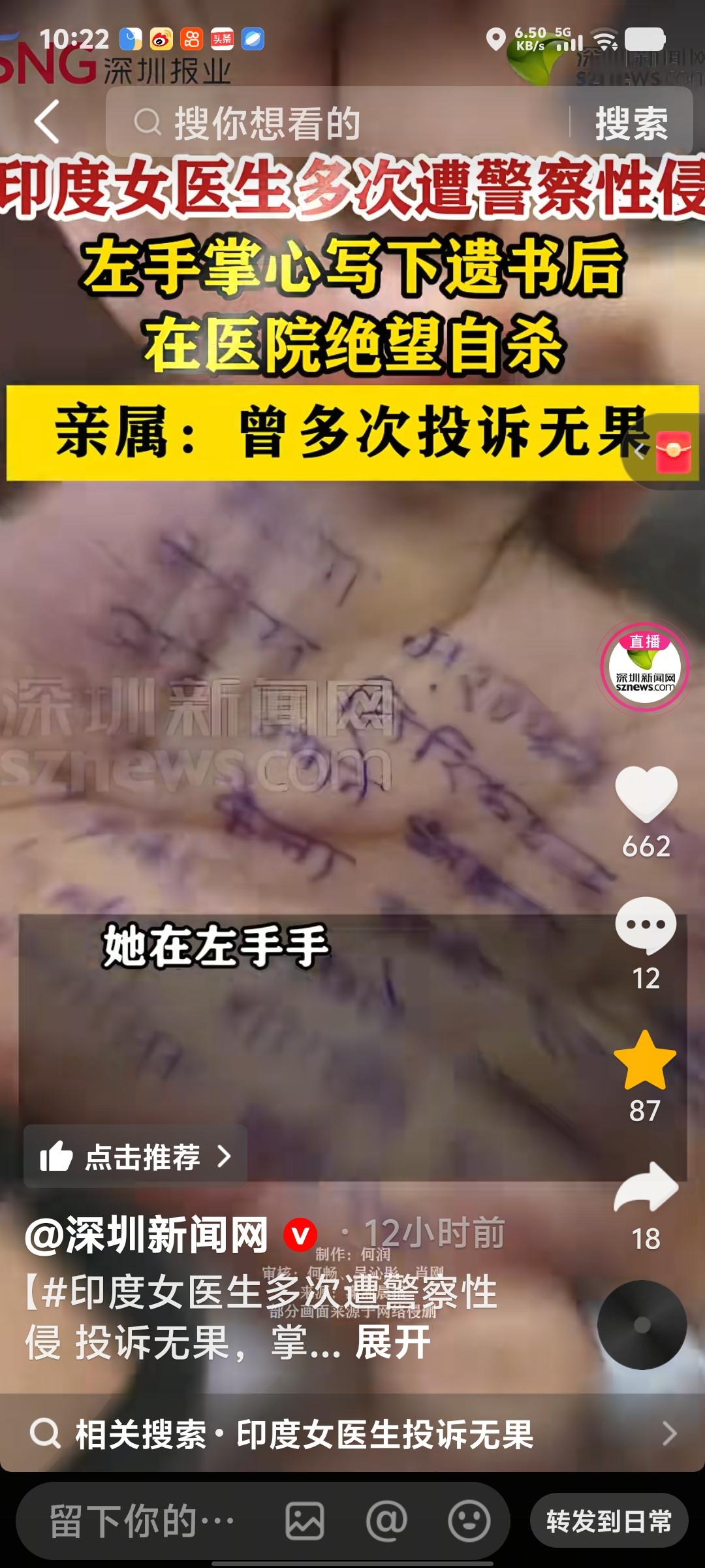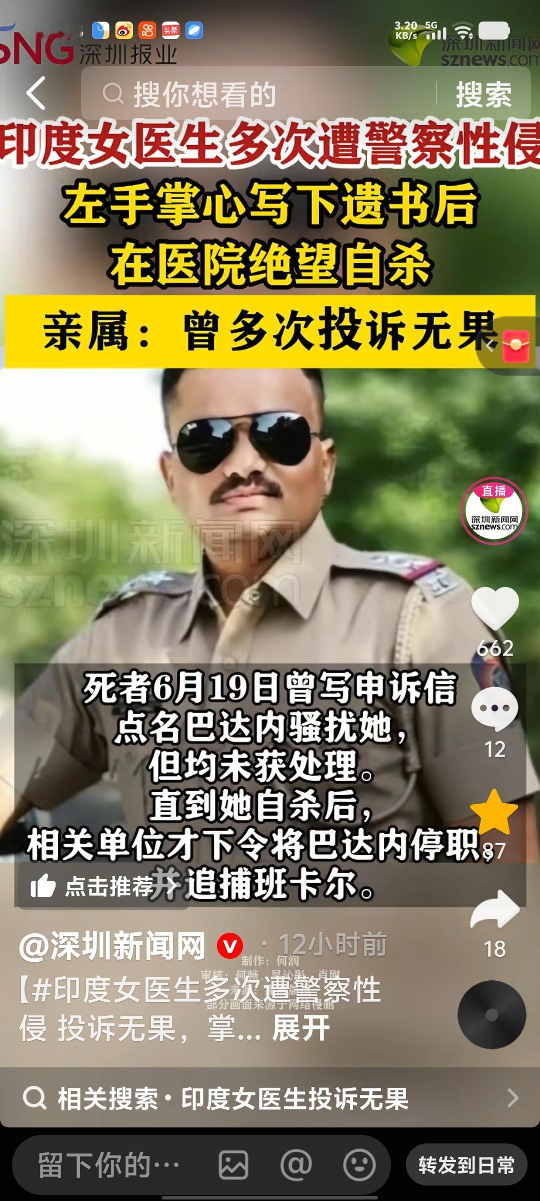 印度女医生遭警察多次性侵、工程师骚扰!投诉无门掌心写遗书自杀,生前还被逼改尸检结果 印度女医生再遭毒手,被警察多次性侵。左手掌心写下遗书。在医院绝望自杀。 印度马哈拉施特拉邦,女医生被戈帕尔巴达内多次性侵。还进行虐待。 同时还被软件工程师精神骚扰。他生前多次投诉。但是无人受理,直到他自杀之后。 两个人才被追捕。女医生负责尸检工作,还经常被政客逼着改尸检,结果他投诉无门。 网友评论。女医生竟然是验尸的。胆子应该很大。既然投诉无门。干脆动手干掉那两个性侵他的人。为什么要自杀呢? 距离上一次女医生被多个男人性侵。死亡的案件轰动全世界,刚过去不久。 又发生了这样的事情。他们的种姓制度根深蒂固。女性地位更低。经常发生因为嫁妆事件。被丈夫虐待致死的案件。 有人评论。大家都好好活着吧。可不要投胎去印度。