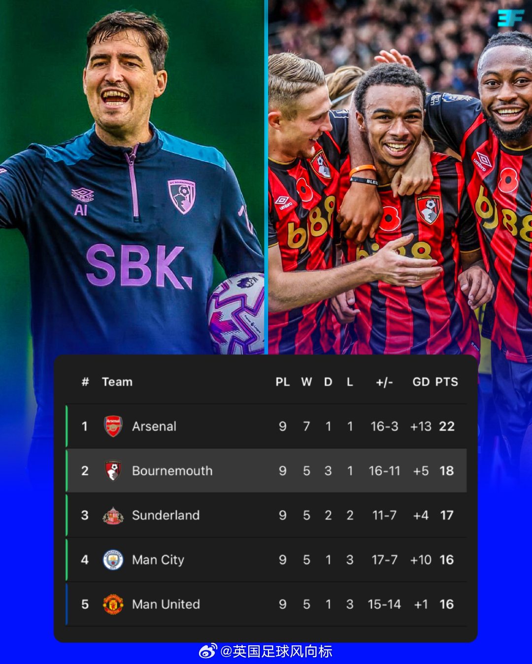 【英超黑马】今年夏窗被挖走多名主力的伯恩茅斯,在新赛季英超前9轮, 踢出5胜3平1负的精彩表现,积分榜排名第2位,落后榜首的阿森纳4分。下一轮,伯恩茅斯将要作客曼城,踢争四大战!