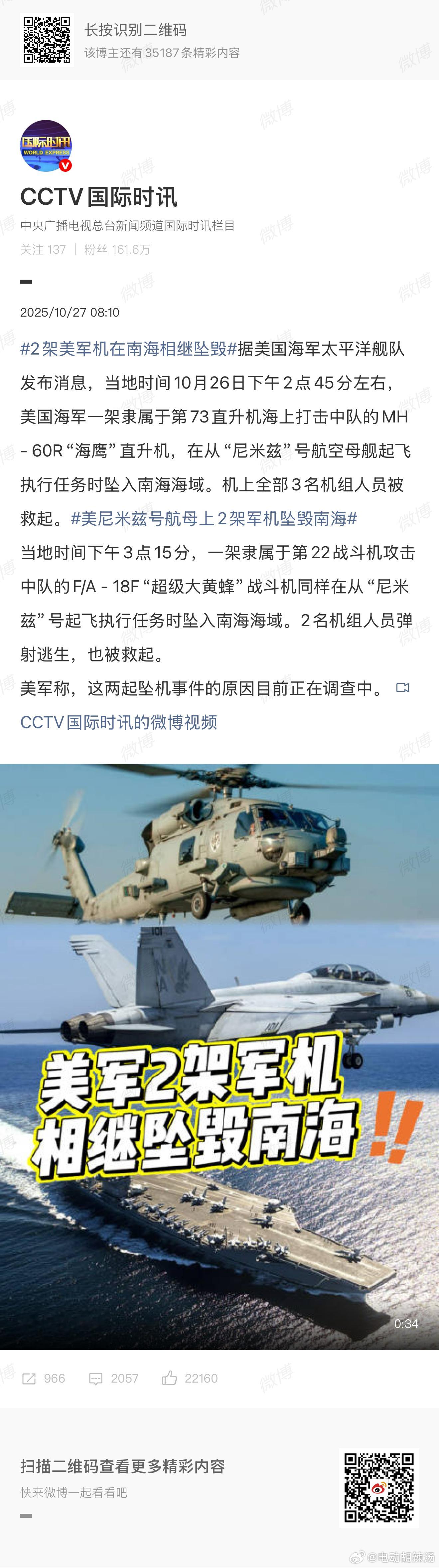 2架美军机在南海相继坠毁到底是飞行员操作不当,还是飞机供应商质量问题,需要好好调查下!