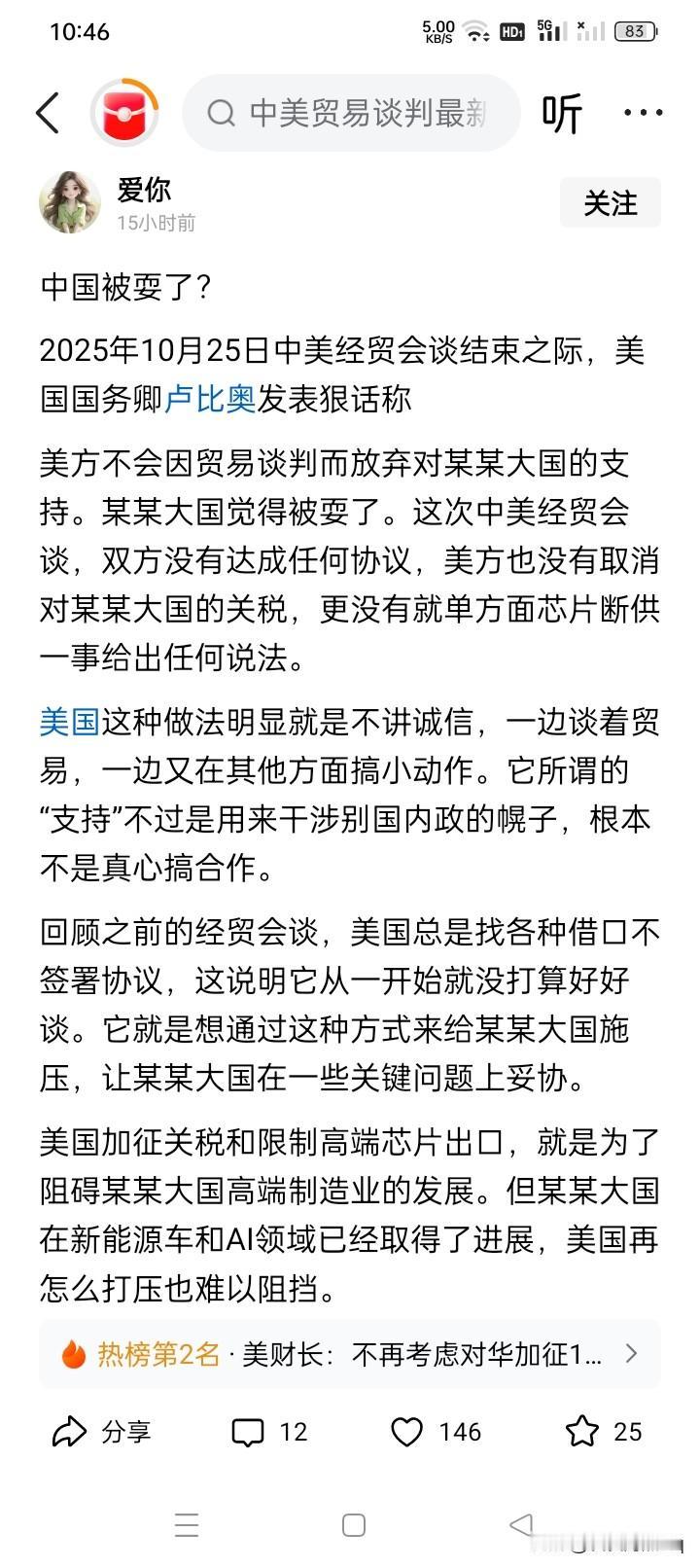 谁也不怕谁? 中美在10月25日的经贸会谈结束了,似乎并没有取得什么具体的成果,但双方似乎都没有将谈判的大门关闭,而仍然是敞开着继续磋商、谈判的大门,以及沟通协调的渠道。 无论任何冲突,不管是武力的、还是贸易的,只要有冲突,实际上就是不存在谁怕谁的问题。当然,这里面肯定是存在心理上的较量,比如夸大其词的吓唬等等。 但是,发生冲突的双方,基本上可以肯定,并不可能完全势均力敌,一定有一方的力量在并不明显的情况下稍微弱一些。那么,最后是各自退一步,作出妥协,达成协议,还是一硬到底,两败俱伤,就看各自的智慧了。