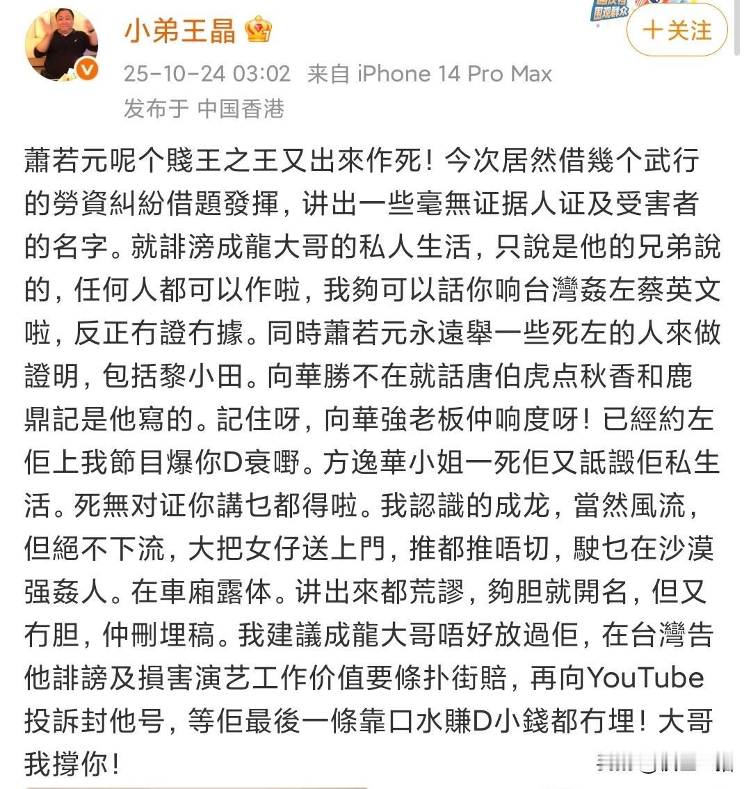 王晶力挺成龙,才发现他们两个关系原来这么好,王导动怒很少见,但是这次在香港记者爆料成龙的事情上,王晶直接动怒了,一位叫萧若元的记者说,成龙私生活混乱,还强迫女明星做不可描述的事情。 内容辣眼睛王导这时候站了出来,为成龙大哥发声怒斥,肖某胡说八道说,成龙大哥没有这么不堪,他虽然风流,但绝对不下流,而且以成龙的地位跟财富多少人排着队,想跟他搭上关系,他怎么可能用强迫手段? 最后他直接喊话成龙,不要放过肖某,成龙大哥如果知道了,不得感动死吗?王晶跟成龙很少有交集,这次能够挺身而出,想必呀是出于对一位敬业的功夫明星的敬佩吧。 各位读者你们有什么看法?欢迎在评论区讨论。