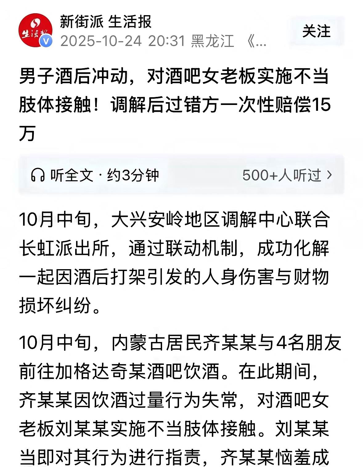 “喝不了就别喝!”内蒙古一男子和朋友去酒吧玩,喝多之后,发现旁边有个美女,为了在朋友面前露一手,竟然走过去对女子动手动脚,没想到,遭到女子大声呵斥,周围人全都看过来,男子觉得丢了面子,借着酒劲,一拳将女子打翻,2名男顾客路见不平拔刀相助,男子的朋友以为他被欺负,也加入战团!女子选择了报警,结局令人极度舒适。 这男的喝得脸红脖子粗,走路都打晃,还特意回头跟朋友挤眉弄眼,那架势就是想耍帅装酷。 他凑到女子身边时,先是嬉皮笑脸地搭话,见女子没搭理,直接伸手就往人家肩膀和胳膊上摸,动作特别轻浮。 女子吓得赶紧往旁边躲,嗓门一下子提了起来:“你干什么!离我远点!”声音又急又怒,周围原本热闹的音乐都盖不住。 周围人瞬间安静下来,目光全聚焦在他俩身上,男子脸上的笑瞬间僵住,酒劲上头的他觉得在朋友面前丢了大脸,眼神一下子就变凶了。 没等女子反应过来,他攥着拳头就朝女子脸上挥过去,力度大得让女子直接往后倒在沙发上,头发都散了,看着特别狼狈。 这时候邻桌两个大哥“噌”地站起来,一看就是实在看不下去了,冲过去一边把男子拽开,一边怒斥:“打女人算什么本事?真窝囊!” 男子的三个朋友本来在旁边起哄,见他被拉着,以为兄弟受了欺负,抄起桌上的啤酒瓶就冲过来,有的拽人有的推搡,酒吧里的桌椅都被撞得东倒西歪,啤酒洒了一地。 那两个大哥也不含糊,一边护着女子,一边格挡,没主动动手伤人,就是想拦住这群疯疯癫癫的醉汉。 女子爬起来后,第一时间掏出手机报警,声音带着哭腔但特别坚定,还不忘拍下现场视频留证据。 民警赶过来的时候,那几个醉汉还在撒泼,被民警厉声呵斥后才老实下来,一个个低着头不敢吭声。 最终处理结果是,男子因猥亵和殴打他人被行政拘留10天,还得赔偿女子的医疗费和精神损失费,他那几个参与斗殴的朋友也被罚款警告,几个人加起来赔了不少钱,可谓是“赔了夫人又折兵”。 别把酒精当没教养的遮羞布,更别把耍流氓当“露一手”的本事。真正的男人不是靠欺负女人撑面子,而是像那两位大哥一样,在别人遇到不公时敢站出来。 这结局舒服的不只是处罚本身,更是让我们看到,不管在哪,正义和底气永远站在守规矩、懂尊重的人这边,耍横的终究只会搬起石头砸自己的脚。