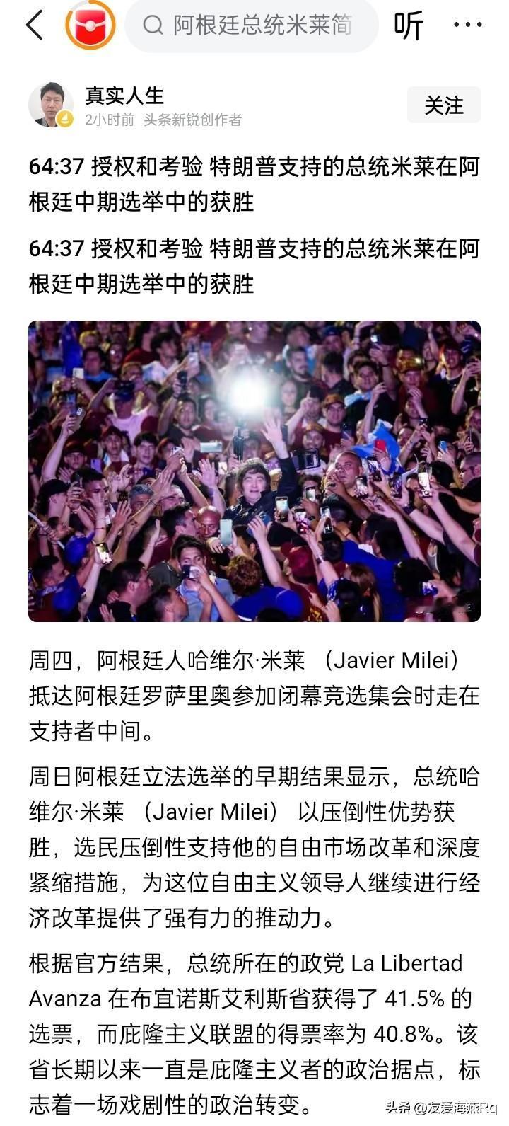 米莱赢了! 10月26日阿根廷的中期选举结束了,阿根廷强势改革派现任总统米莱领导的执政党,在议会的改选中获得了压倒性胜利。米莱领导的执政党在众议院的席位,在这次中期选举中共计需要选举的127个席位中,从过去的37个席一跃而上升到64个席位,获得了绝对优势胜选。 这与之前某些人预测米莱将在中期选举中大败而归的推断,结果截然不同,形成了鲜明的对比。这说明了在阿根廷民众中,对米莱总统进行市场化和紧缩政府开支的改革政策,受到了相当多的人的支持。 不过,由此也可以看到,有些人带着主观意愿而发表的文章,是多么的不靠谱。