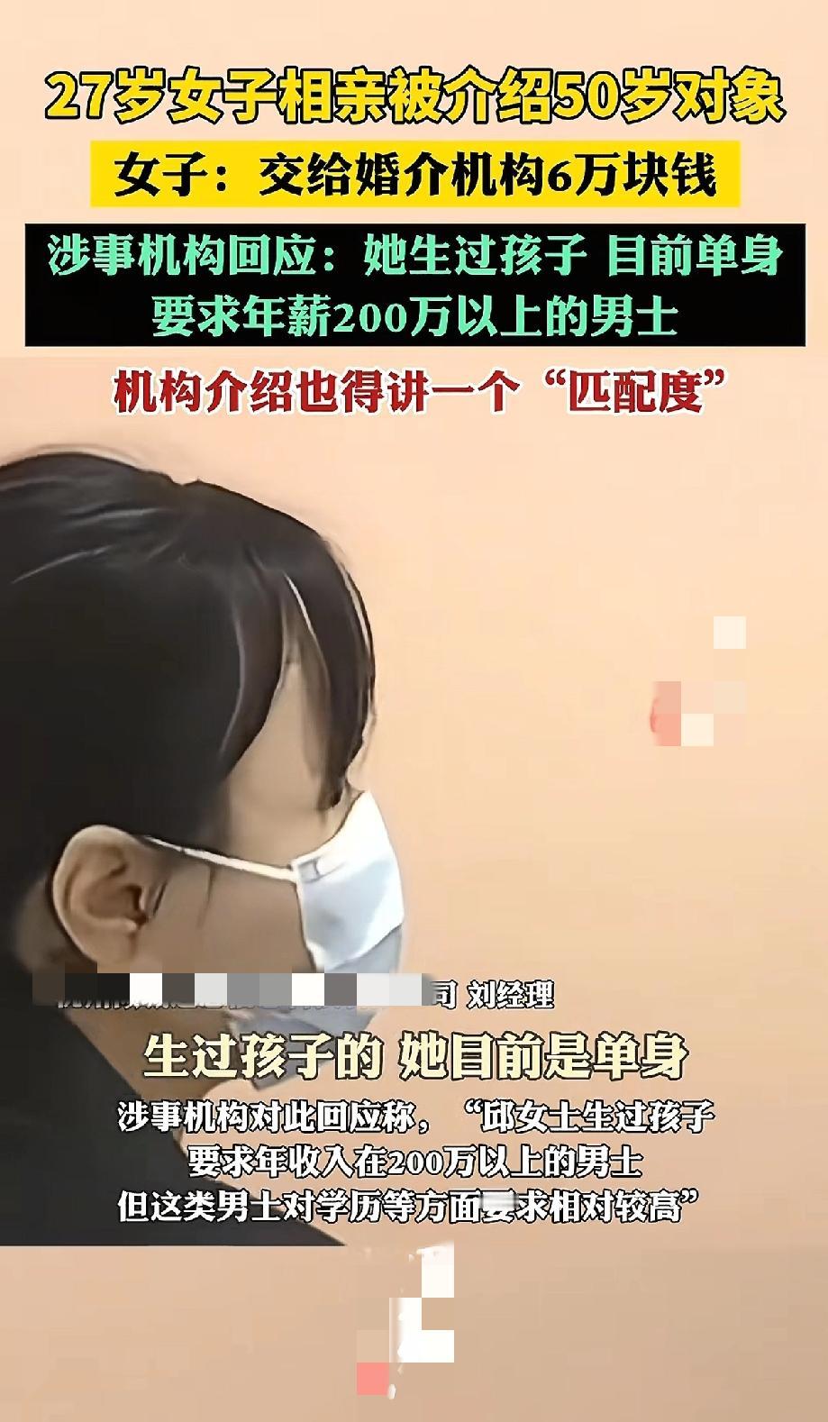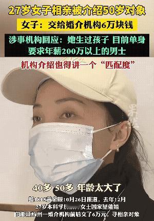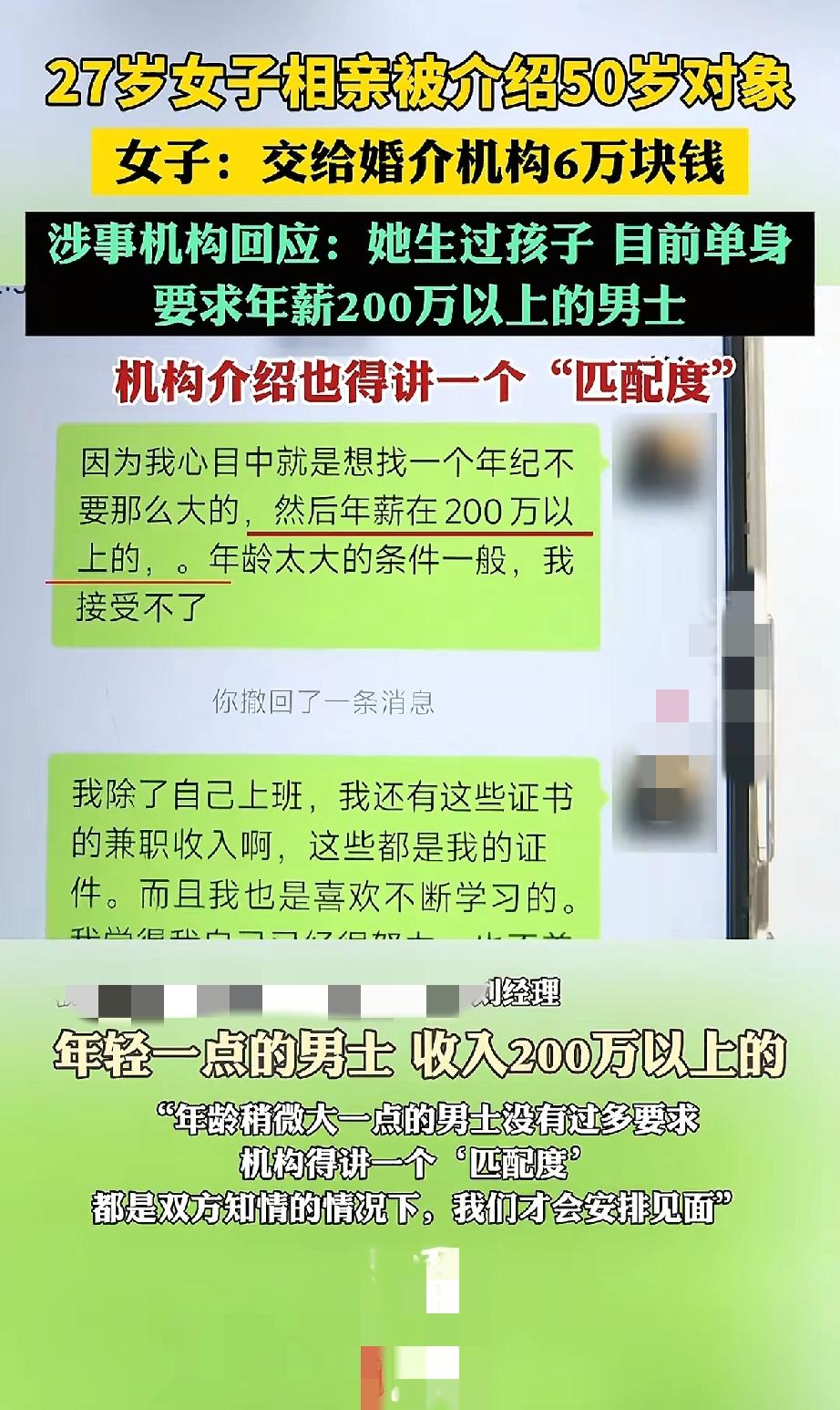 女子向中介交了6万块钱找对象,没想到给匹配的对象年龄比自己大了很多。女子要求中介退还自己的5万元钱。 中介给出的解释是要讲究“匹配度”。女子要求中介给自己介绍年薪200万以上的男士。但是能够达到这个要求的年轻男士要求女方学历要高。只有年龄大的没有要求。 对此你有什么看?