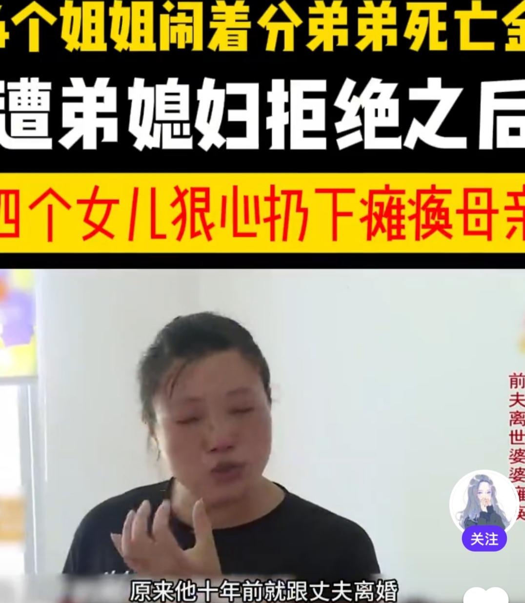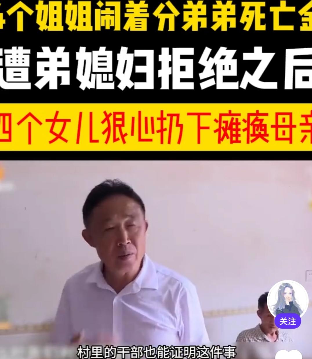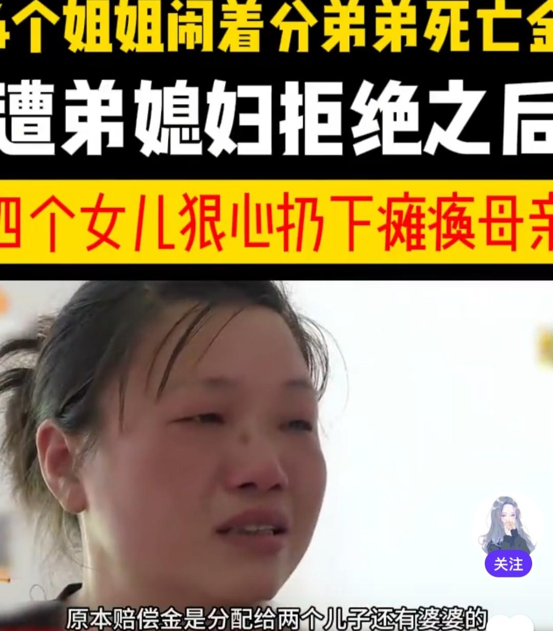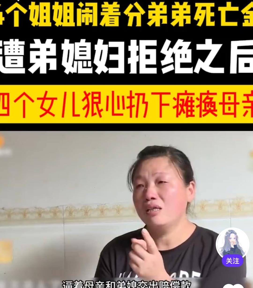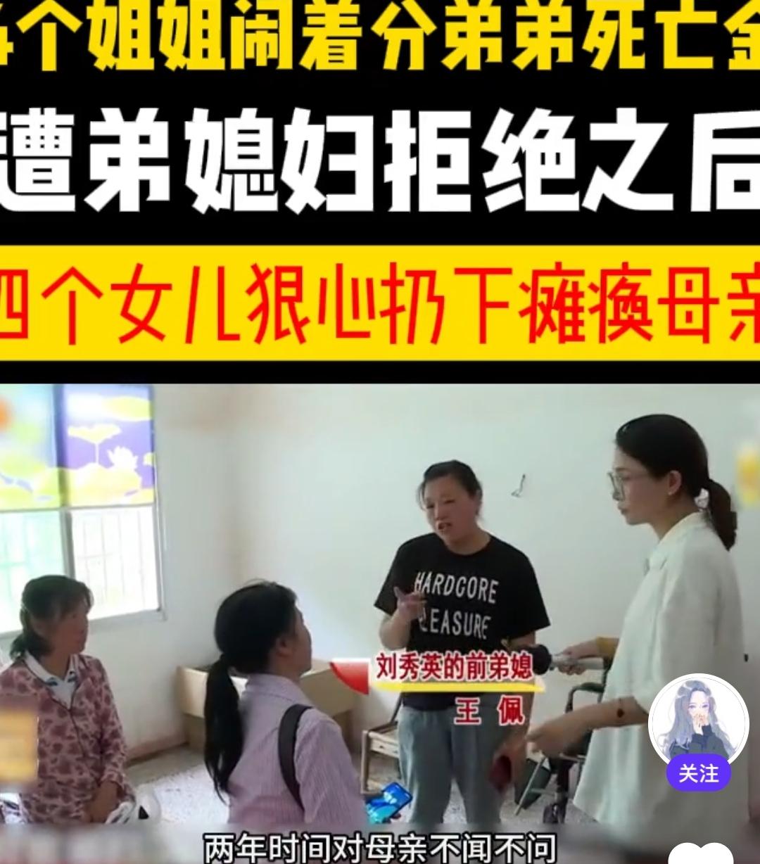 4个姐姐闹着分弟弟死亡金,遭弟媳妇拒绝之后,四个女儿狠心扔下瘫痪母亲! 看到相关自媒体平台发布的这个纪实事件,真的是让人抑制不住地想冒火,弟弟因为一次意外车祸不在了,就有一个死亡赔偿金,而这个赔偿金,最开始不知道什么情况说了一个115万,没有具体说明为什么是115万,大概是家人要求对方赔偿这么多吧,但是最终判决书下来后,实际只有71万,而这几个姐姐死咬着有115万,说其他的是弟媳独吞了,跳得最凶的是二姐刘秀英,面对记者,她直言就算只有71万,也没有弟媳的。 弟弟出事后,弟媳改嫁了,当时婆婆觉得儿媳妇给自己家生了两个儿子,为了让两个孙子过得好,就把钱都让儿子保管,那四个姐姐就三天两头来找自己亲妈和弟媳妇要钱,遭到拒绝后,四个白眼狼就对老人不闻不问,把自己亲妈扔给了前弟媳,前弟媳叫王佩,是个善良的人,前婆婆没有人照顾,关键是前夫出事后,前婆婆受不了打击瘫痪了,身边离不开人,四个女儿不管,只有她去照顾,毕竟是两个儿子的奶奶,而且看情况,前婆婆对她这个媳妇也还不错的。而赔偿金本来也是属于跟弟弟直系的老母亲和两个孩子的。 前夫走后,老人瘫痪在床后,一直是王佩在照顾前婆婆,好在她改嫁的现任丈夫也是个心地善良的人,跟她一起照顾老人,为了方便照顾,他们便搬到了老人家里,而最近两年四个女儿都不闻不问,老人只好将四个白眼狼告上法庭,最后判她四个每人每个月支付800元赡养费,这下又不愿意了,又跳出来闹分钱,老二死咬着有115万,王佩拿出判决书,上面明明白白写着71万,因为当时对方不愿意给,只给了最开始的10万作为丧葬费,后面将对方告上法庭,判决71万,那么还剩61万,诉讼费花了20万,后面给前婆婆装修现在的房子又花了30万,现在就只剩下10万给两个儿子的了。 二姐刘秀英面对法院判决她每月支付800元赡养费表示自己拿不出来,嘴上一副要好好赡养父母,照顾老人天经地义的嘴脸,实际行动上一点没有付出,记者让他接老人到她自己家照顾,她却借口一大堆,气得记者反问,良心被吃的吗?后面经过记者和村干部的协调,说每月每人支付400元赡养费给前弟媳,但是却警告说必须照顾好,有什么问题就要找前弟媳的麻烦,前弟媳说她可以搬出去,然后事情到这里就结束了,反正法院有判决,不履行就申请强制呗。 所以,这四个当女的,良心都被狗吃了吗?母亲是自己的直系亲母亲,赡养照顾他们是你们的义务,以前有弟弟,你们可以逃避责任,但是现在弟弟不在了,你们才是老人的直系亲人,而两个侄儿还小,还需要抚养,而他们是弟弟的直系后人,弟弟的死亡金本来就是属于两个孩子的,不是自己的非要抢,该自己承担的却想办法逃避,这是为人该做的吗?吃相太难看!真是林子大了什么鸟都有,后代看到你们的嘴脸,必会以你们的方式回馈给你们,善恶到头终有报,自己种下的因,恶果逝必逃不掉!