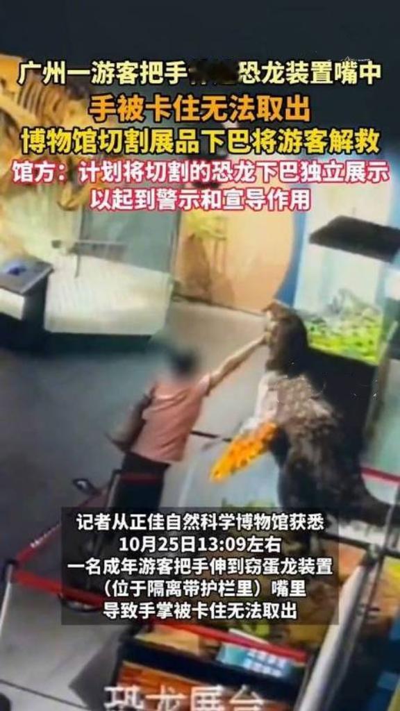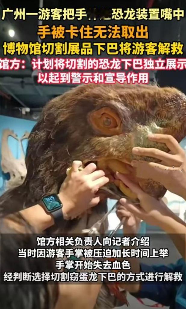 惊!游客一时好奇,竟将手伸进恐龙模型嘴中,结果惨被卡住!这惊险一幕让人捏把汗。大