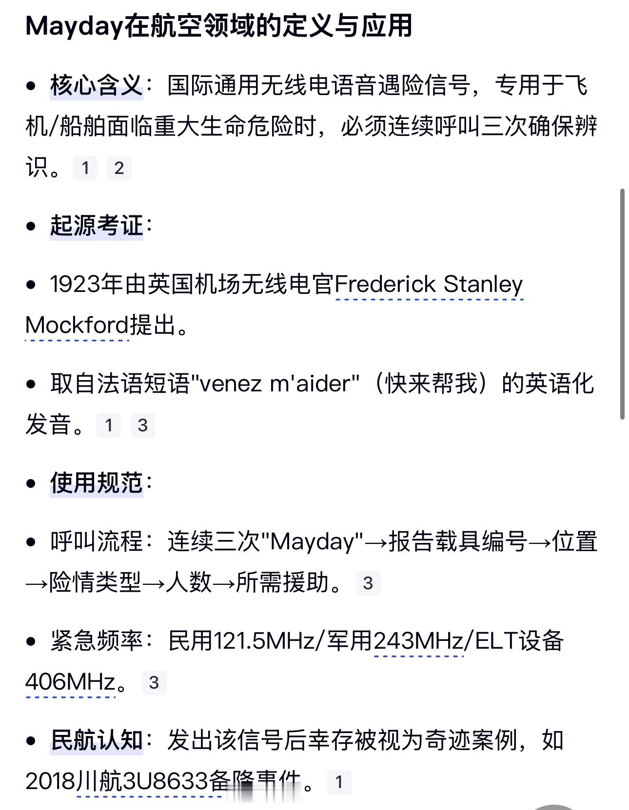 但是,mayday在航空里面还有另一个意思,是国际通用无线电语音遇险信号,专用于飞机/船舶面临重大生命危险时,必须连续呼叫三次确保辨识。