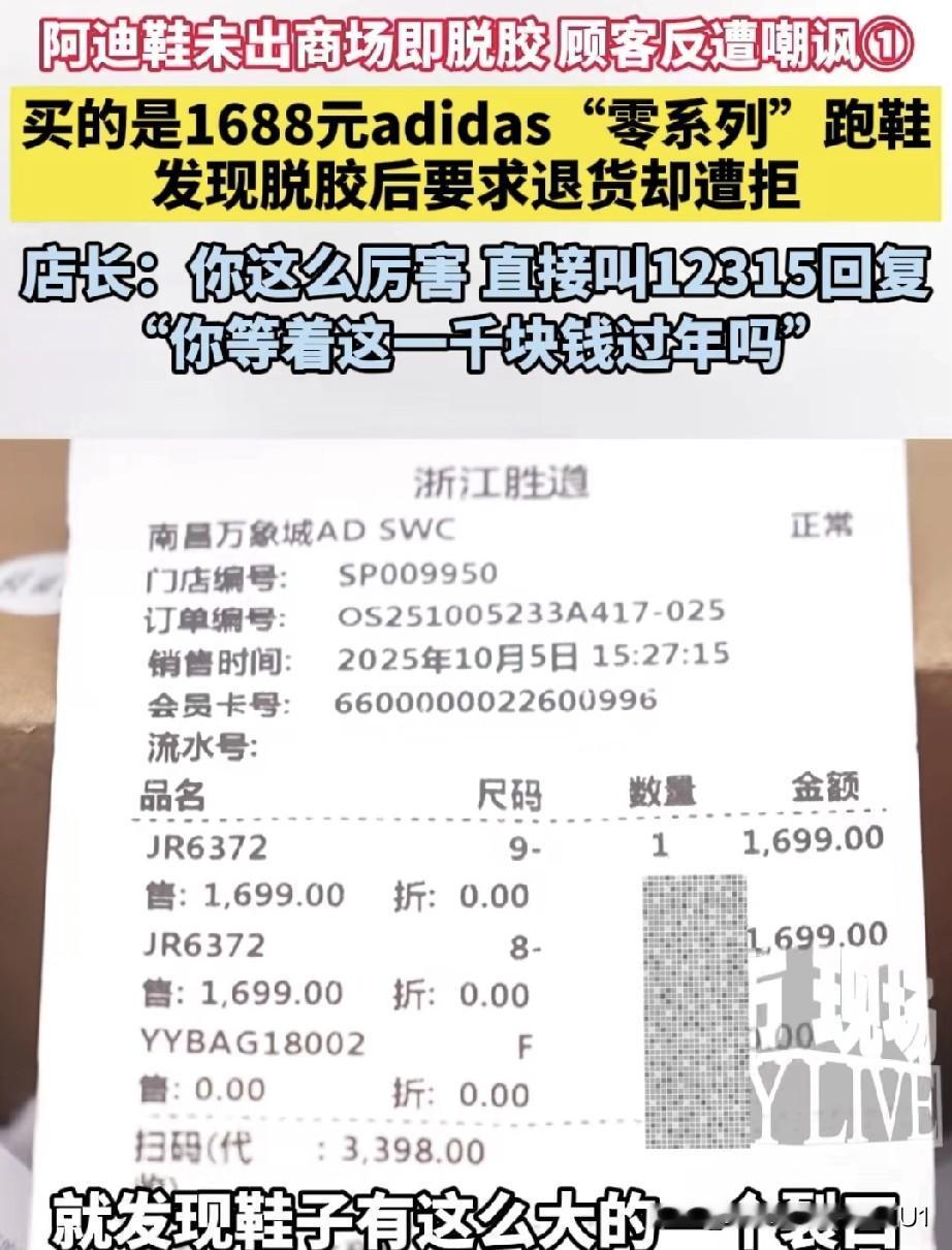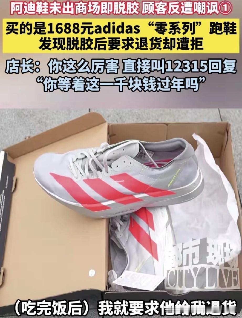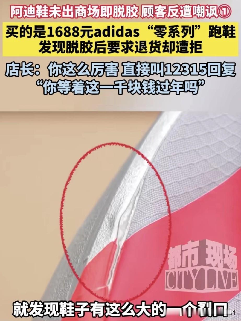 女子在商场花1688元买了一双阿迪跑鞋,随后去商场餐厅吃火锅。等待火锅煮熟时,孩子看了看刚买的跑鞋,发现鞋子开胶,裂了个大口子。 女子吃完饭,返回阿迪专卖店要求退货,却被店长拒绝。店长让女子拨打12315等回复。女子称,自己在商场花1000多买的鞋,还没走出商场就出现这种状况,发现品质问题,有什么理由不给退换?” 实在无法理解商家的做法!他们轻视消费者事小,藐视法律事大!试问,如果这类事情有人管,还会有这样的售货员吗?