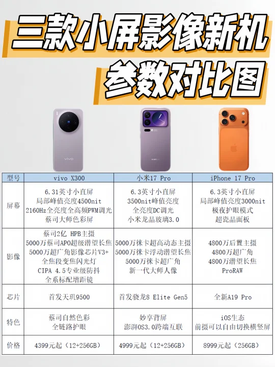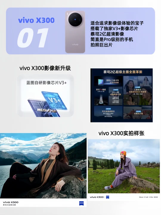 ✔️如果追求影像级体验+护眼屏的,安利vivo X300,搭载了行业独家V3+影像芯片➕蔡司2亿超清影像,它的定位其实是X300 Pro mini,标准版塞下Pro级的配置是尊嘟香‼️256G起步价4399💴