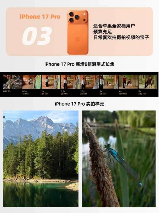 ✔️如果你有果子全家桶的,预算充足,今年的果机17 Pro 值得入手,这次Pro也升级了8倍潜望式长焦,无论是拍照还是录视频,体验感提升不少。256G起步价8999💴