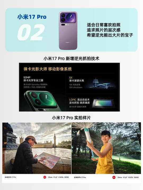 ✔️追求可玩性高的,小米17 Pro今年的背屏设计挺超前的,徕卡三主摄➕16.5EV超高动态范围逆光抓拍,逆光情况下,摄影小白也能轻松出片。256G起步价4999💴