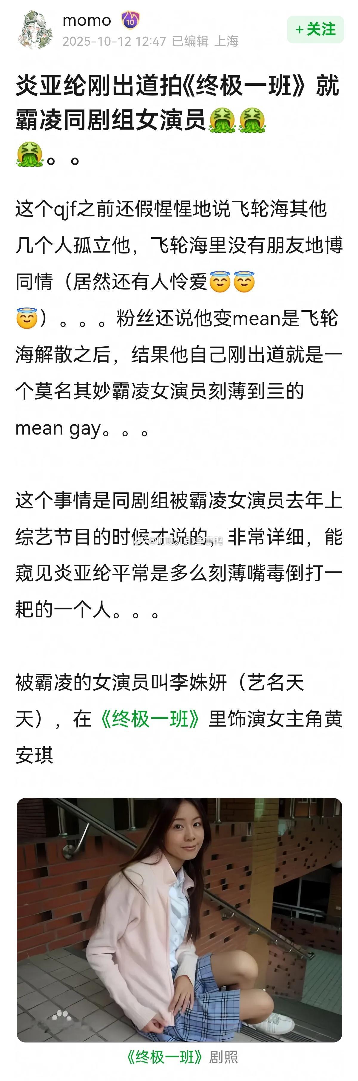 女演员好惨→炎亚纶刚出道拍《终极一班》就霸凌同剧组女演员[呵呵][呵呵]