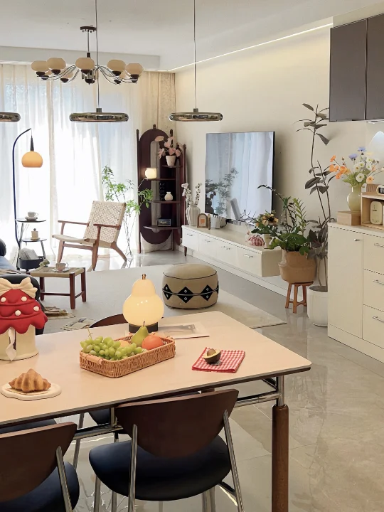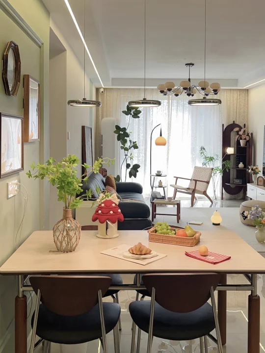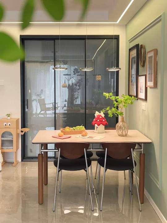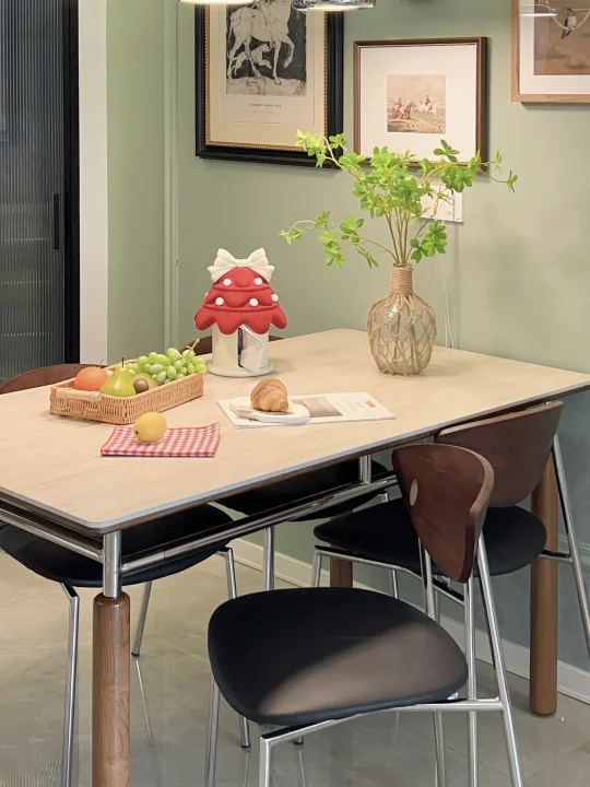 餐厅是我俩待最多的地方了,好看耐用的洞石岩板餐桌搭配飞鸟椅,这么美的小角落都不好意思吃垃圾食品了
