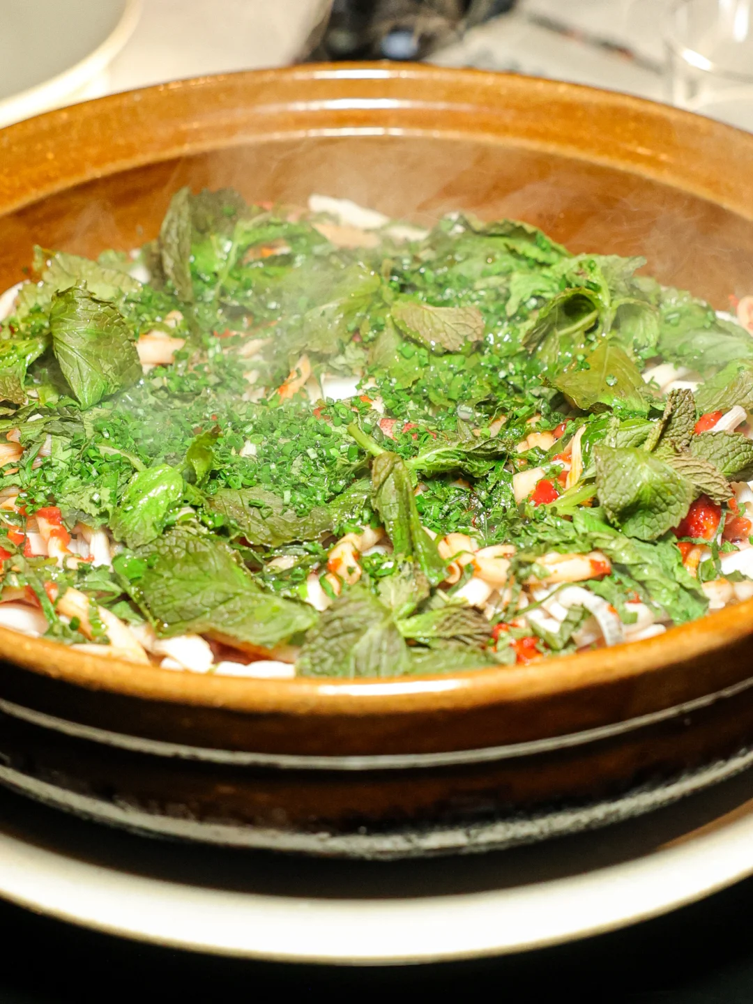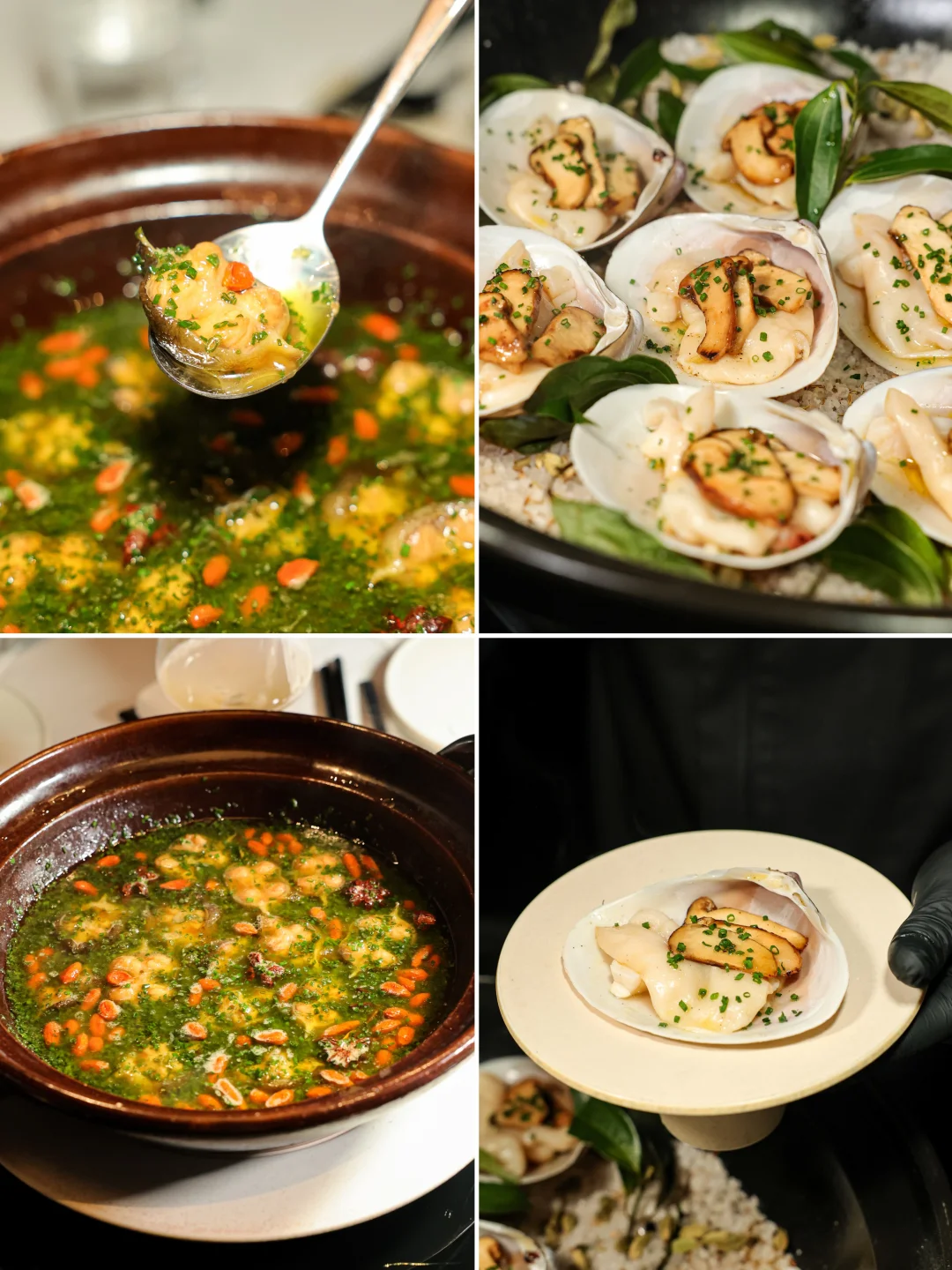 斑节虾满足了我对大块头海虾的想象,完整拆出来的肉吃起来脆弹无比,饱满的同时带着一股子锅气;另一边看着像普通“基围虾”的沙卢虾,吃起来却让我惊掉下巴:怎么会如此嫩的同时饱含通透的甜味,完全不像它看起来的味道。