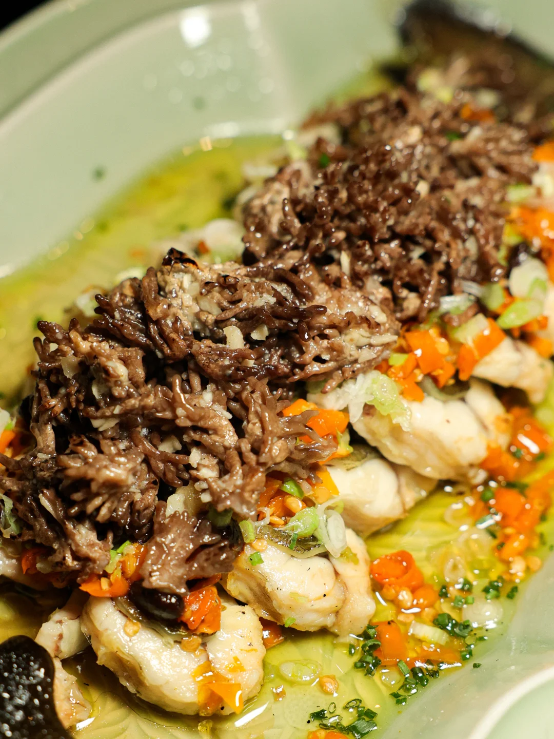 去骨的鳗鱼肉,盖上黄贡椒和龙爪菌蒸制而成。鳗鱼肉处理得极其利落,一块肉进进嘴里就是能以此感受鳗鱼皮的胶质、鳗鱼肉的嫩、以及顶上菌类的脆,就是非常纯粹,没有带一丝一毫泥腥气与不愉悦的味道,每人就分一块肉,吃得却意犹未尽。