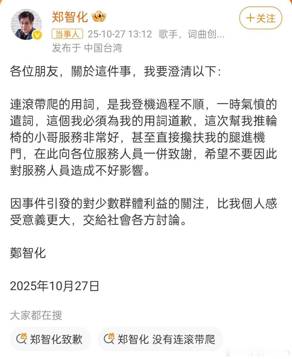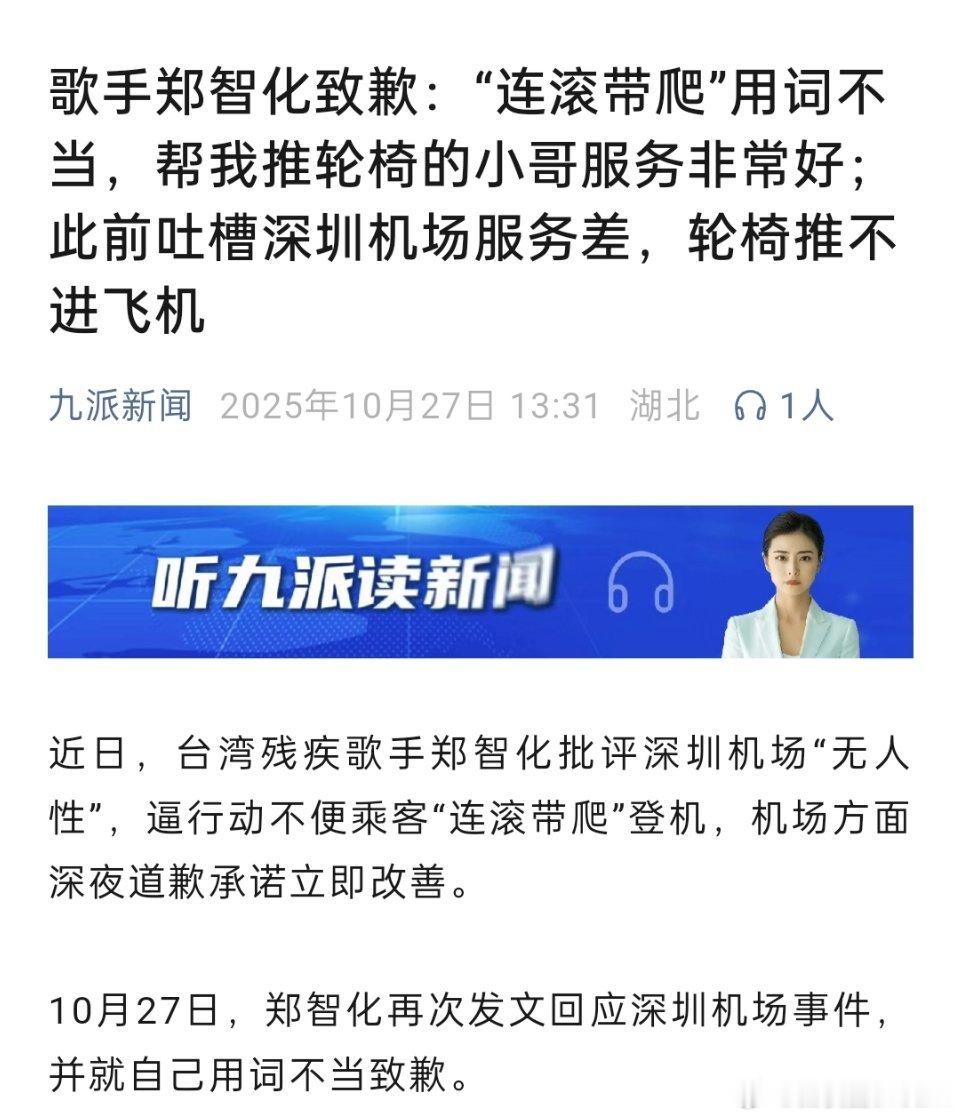 郑智化致歉🔻郑智化道歉了,深圳机场事件,“连滚带爬”用词不当。如果没有监控视频的话,他会主动道歉吗?[摊手][摊手][摊手]