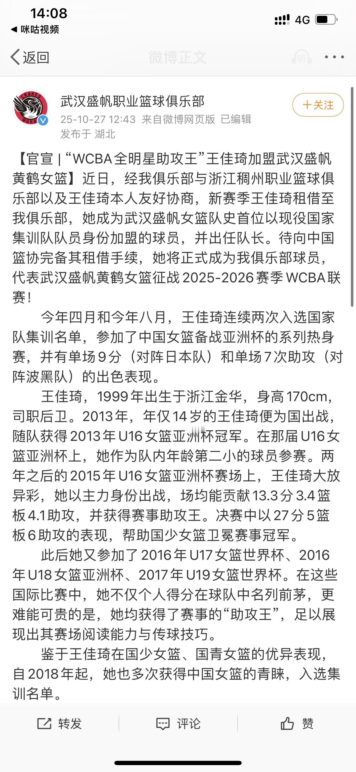 武汉女篮官宣王佳琦加盟,看来目标很大呀! 而浙江女篮,我看这是要锻炼新人到底啊!(是租借) 在此之前,武汉女篮目前已经确定了三位外援,分别是上赛季队内的头号得分手-钱内迪,接着时是卡鲁,我记得好像上赛季也是在浙江女篮,然后是上赛季效力山西女篮奥利维耶 加上回归的老将彭华倩,如果还有刘贝的话,那么这支球队发挥好,打进四强问题不大! 看来武汉盛帆女篮本赛季是想冲击一下总冠军的呀! 就算不能成功,至少说明本赛季又会出现一支较为强劲的队伍! 这便是人家武汉盛帆老板的给力啊!