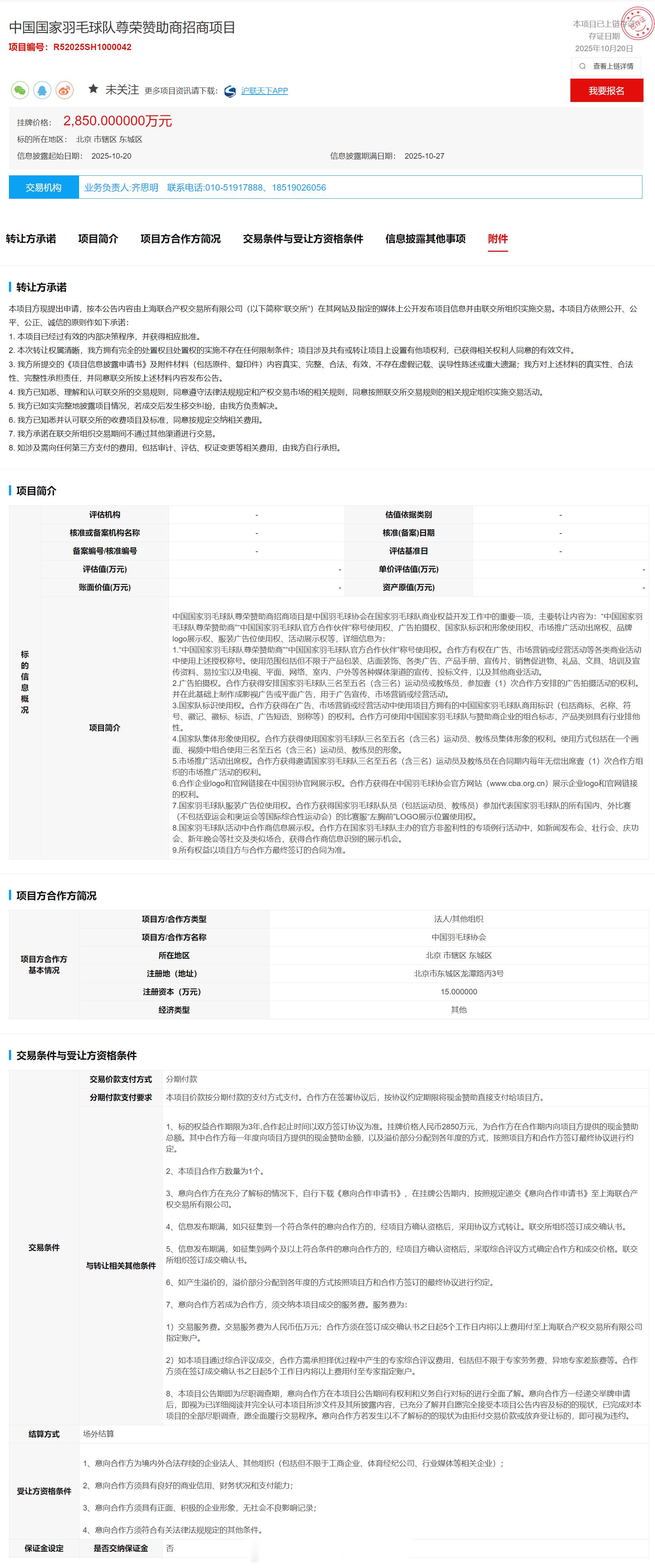 合作期限为3年,合作起止时间以双方签订协议为准。挂牌价格人民币2850万元,为合作方在合作期内向项目方提供的现金赞助总额。