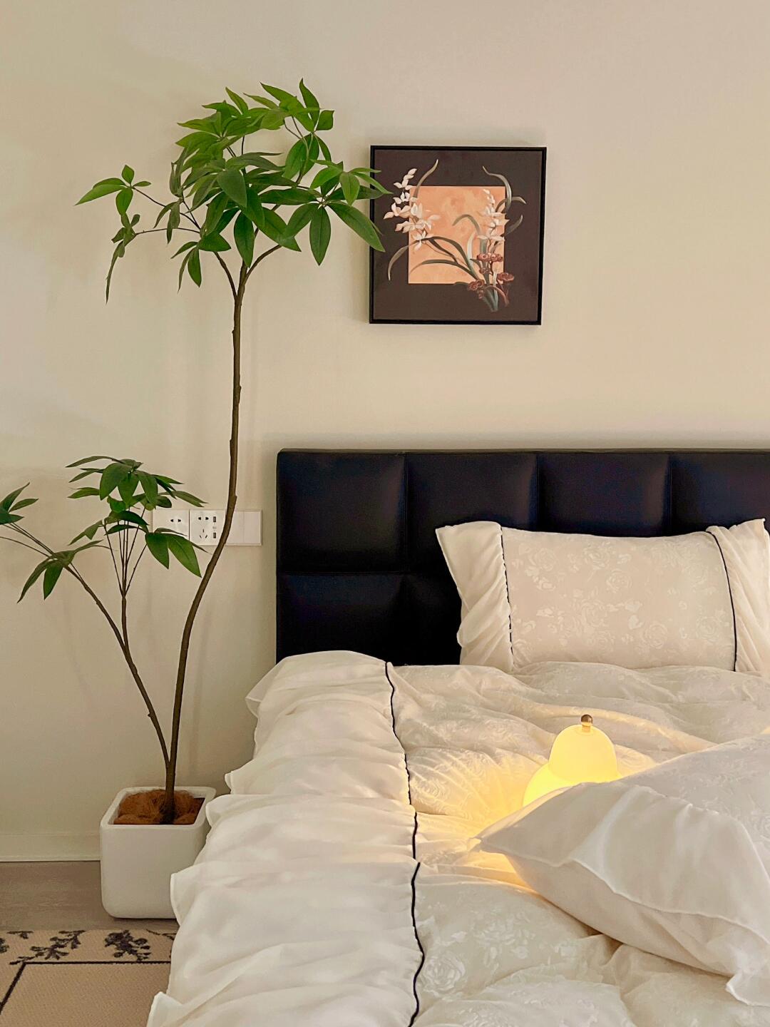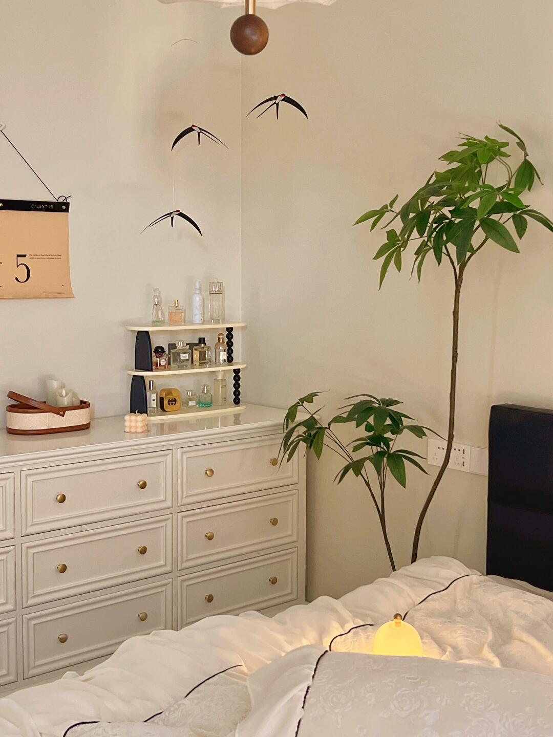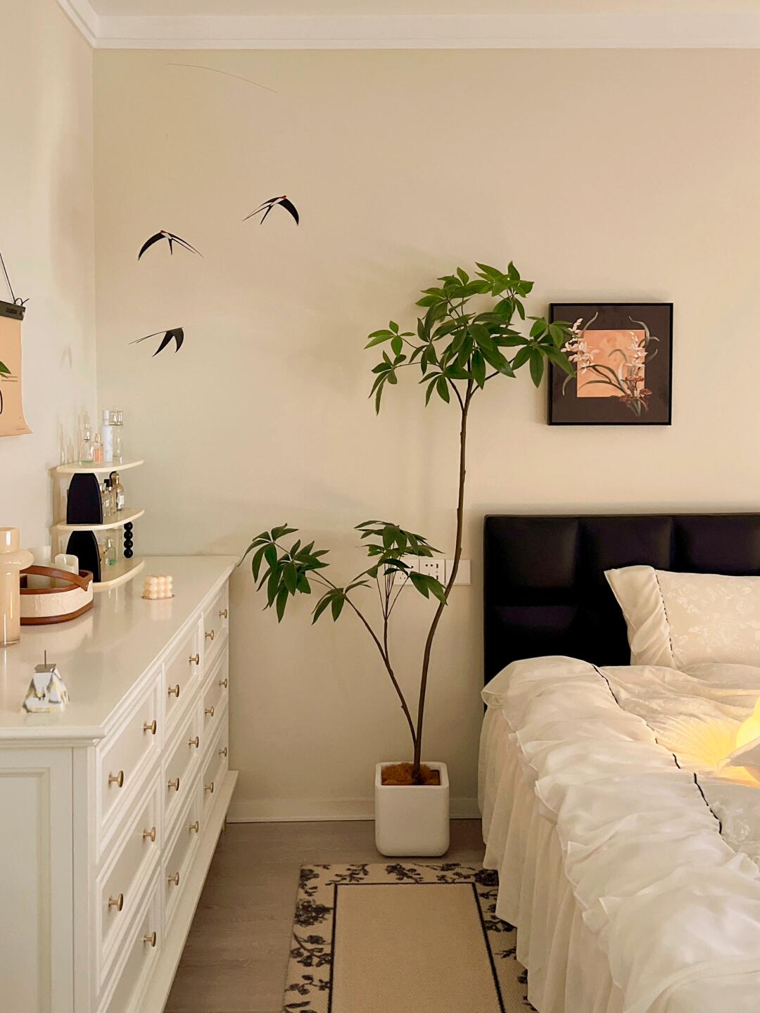 卧室暖暖的才好眠,温馨的暖色真的好治愈 感觉床边还是放一体式斗柜更实用也更顺眼 卧室多放些绿植花花真的好有生机 就算仿真绿植也是氛围感满满 恨不得马上钻进毛茸茸的小被窝~ -