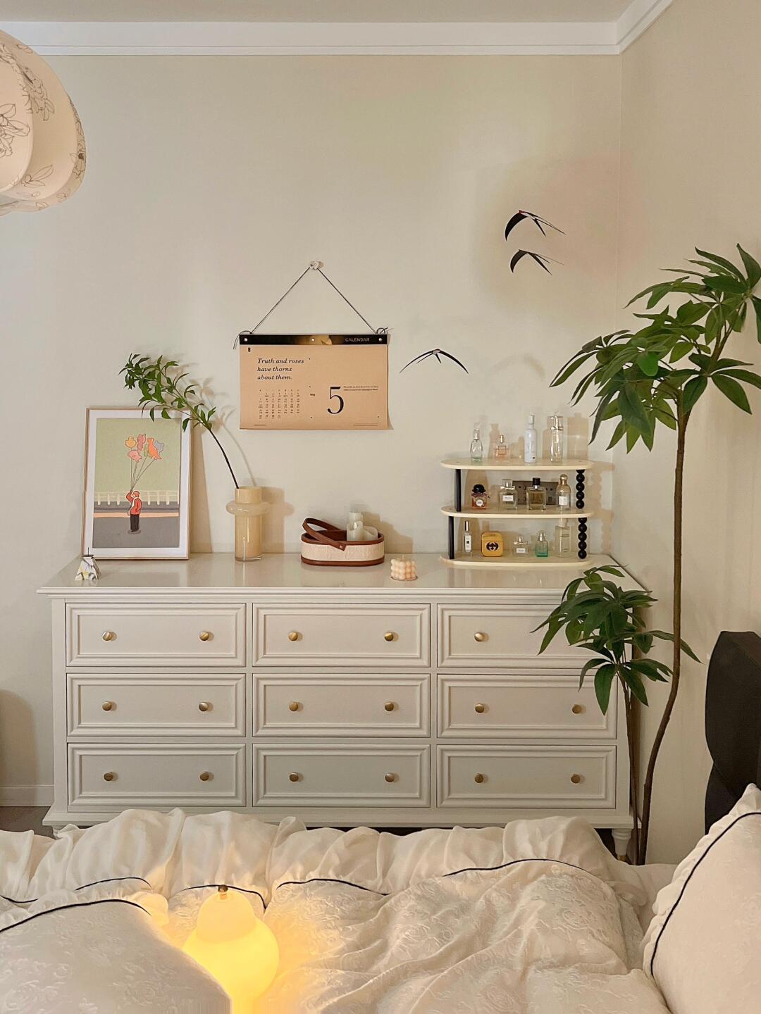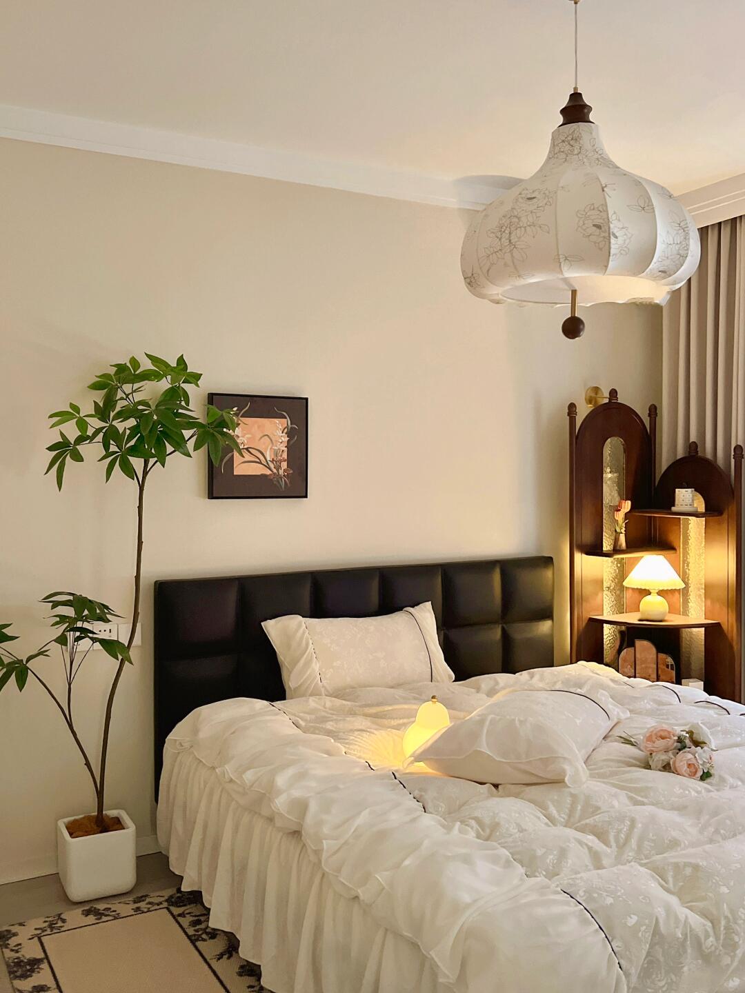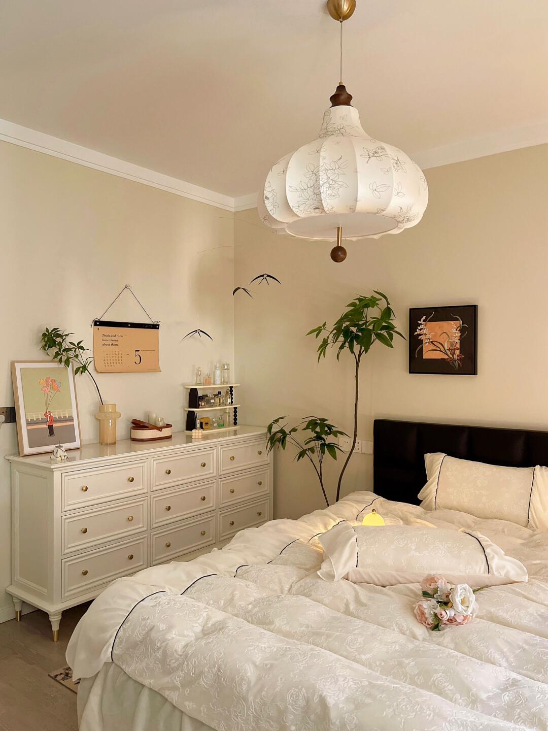 卧室暖暖的才好眠,温馨的暖色真的好治愈 感觉床边还是放一体式斗柜更实用也更顺眼 卧室多放些绿植花花真的好有生机 就算仿真绿植也是氛围感满满 恨不得马上钻进毛茸茸的小被窝~ -