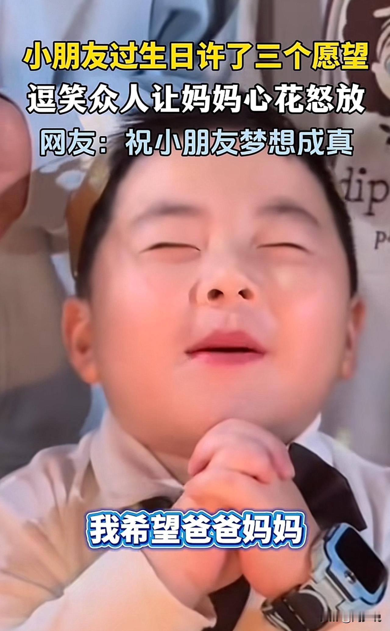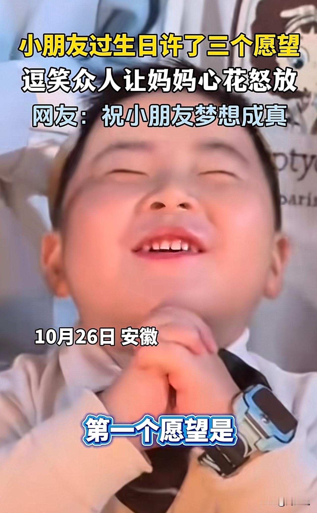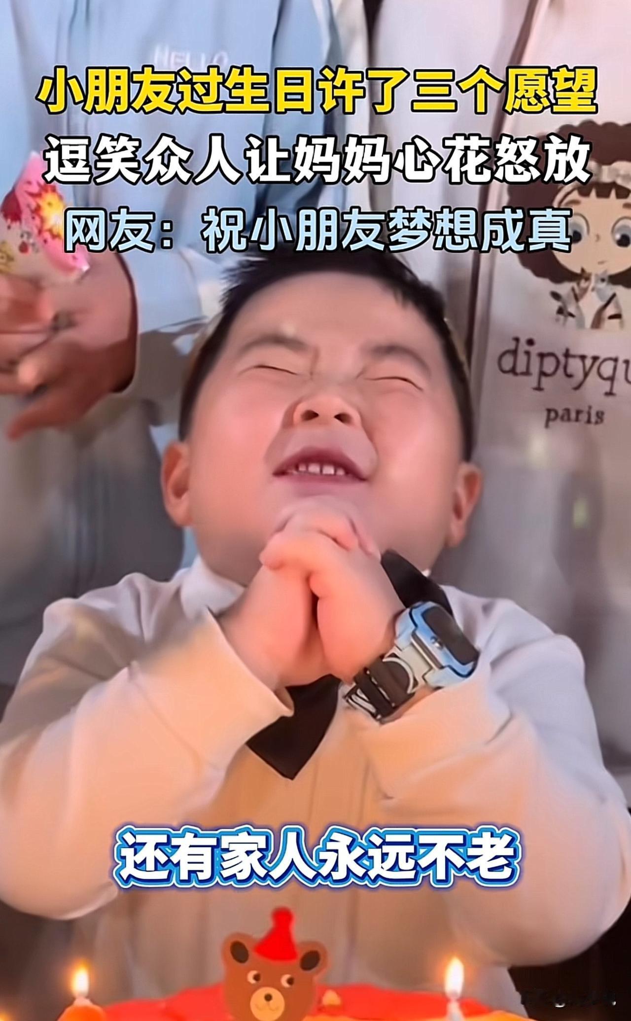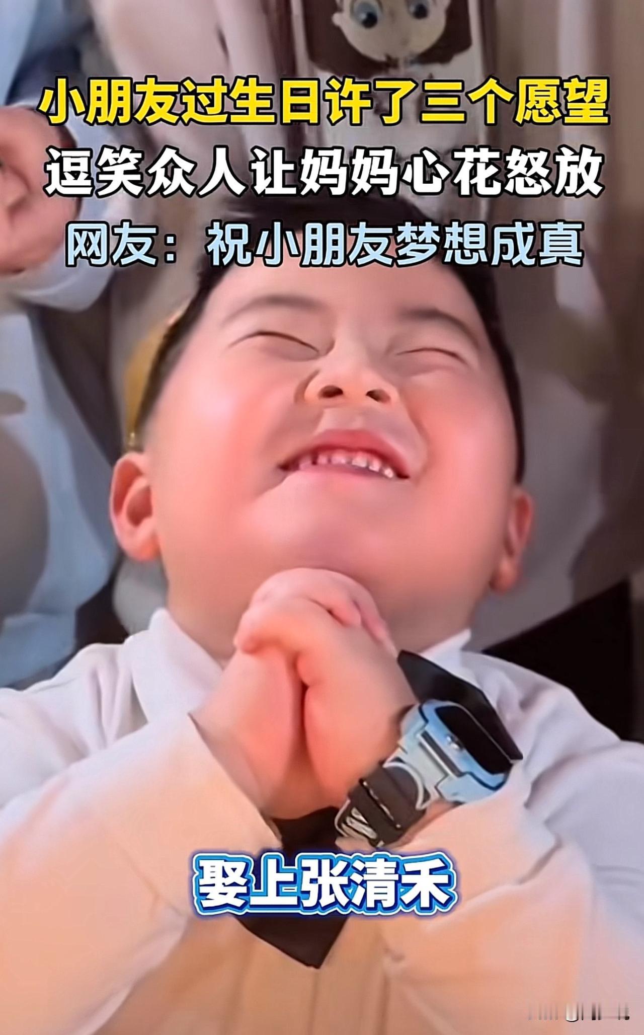 “真要被笑哭了!”安徽,一位小朋友过生日,许了三个愿望,这位小朋友说第一个愿望是祝愿全家人永远不老,永远不死;第二个愿望是希望我妈妈,有八个男模;第三个愿望是希望自己快点长大成大人,早日娶上张清禾。 此话一出,逗得在场的众人纷纷大笑,纷纷表示祝小朋友梦想成真。 看完之后,周少不得不说真要被这位小朋友笑哭了,简直太可爱了。 果然孩童的许愿从不藏着掖着,既有对家人的纯粹牵挂,又有被外界影响的天真脑洞。 这份毫无修饰的直白,恰恰是最动人的童趣,也难怪能戳中众人的笑点与萌点。 对于这位小朋友许的生日愿望,大家怎么看呢?#寻美三湘# #长沙新朋友#