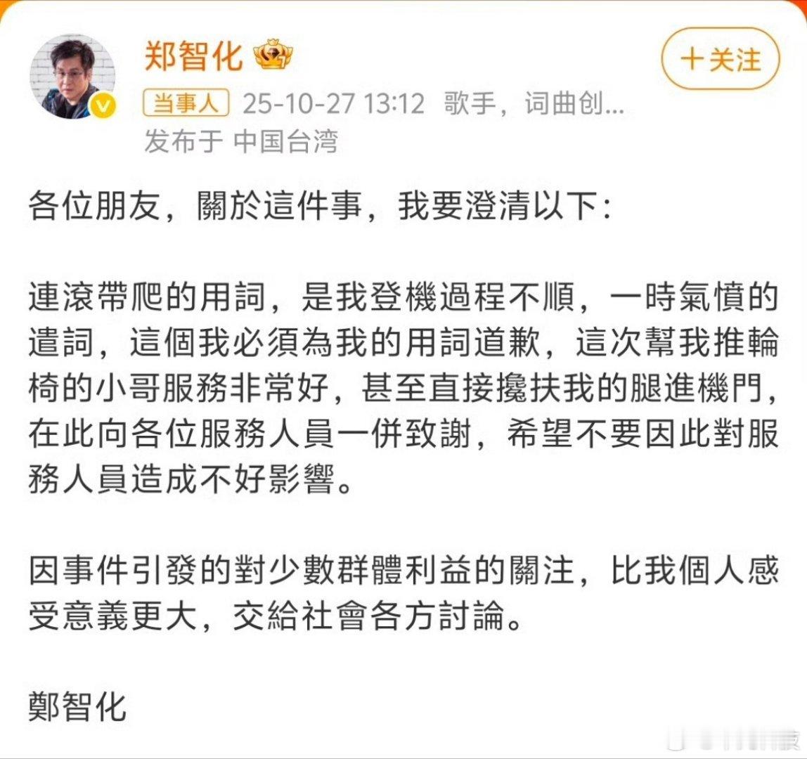 郑智化致歉服了,还好有监控啊,不然又要抹黑我深圳机场了!看视频监控,几个工作人员服务十分到位!十分符合深圳的服务理念!不过又说回来,看完视频,你们觉得郑智化当时对机场的埋怨与责骂对不对?