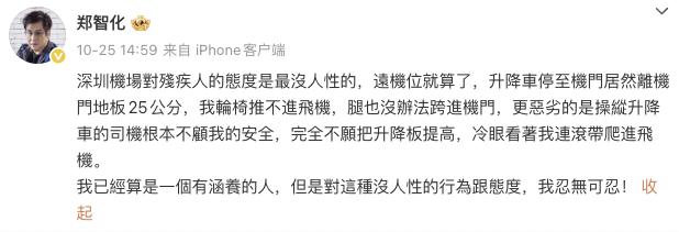 才骂了深圳机场没2天,郑智化就不得不出来道歉。 10月25日,郑智化骂深圳机场没人性,连滚带爬。 10月27日,在汹涌的舆论面前,郑智化不得不出来道歉,说自己没有连滚带爬,是自己口不择言了。 郑智化也真够可怜的,本来残疾人坐飞机就够难的了,面对不适体验,吐槽几句,还要出来道歉。这个社会还是应该有更多的同理心,而不是站在健康人的角度去指责残疾人。
