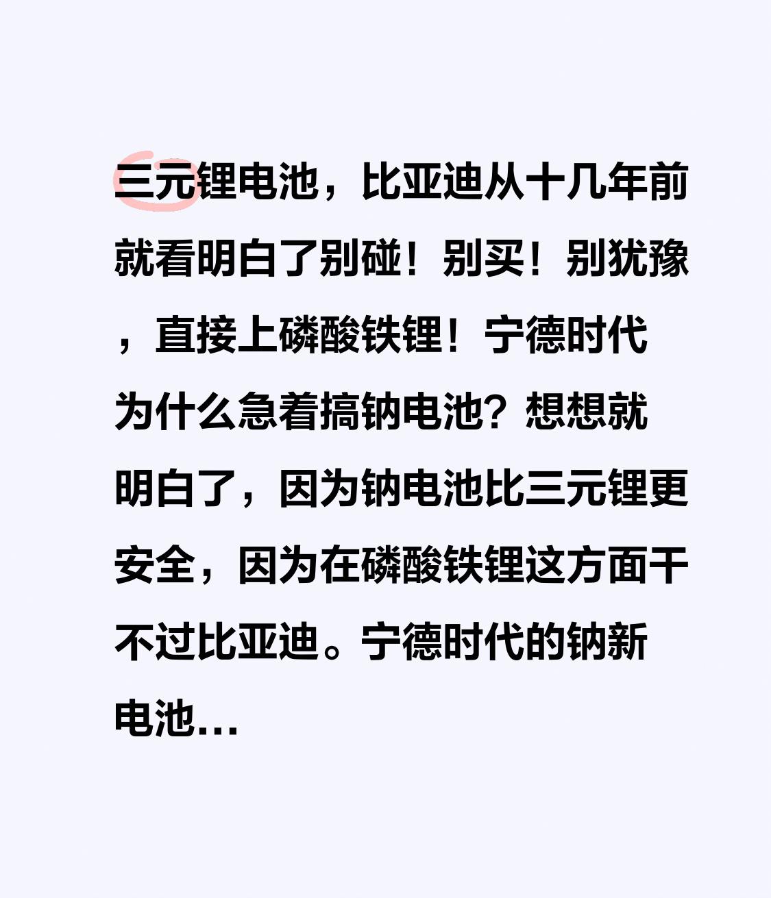 三元锂电池,比亚迪从十几年前就看明白了 别碰! 别买! 别犹豫,直接上磷酸铁锂! 宁德时代为什么急着搞钠离子电池? 想想就明白了,因为钠电池比三元锂更安全,因为在磷酸铁锂这方面干不过比亚迪。 宁德时代的钠新电池上市可以期待一波。