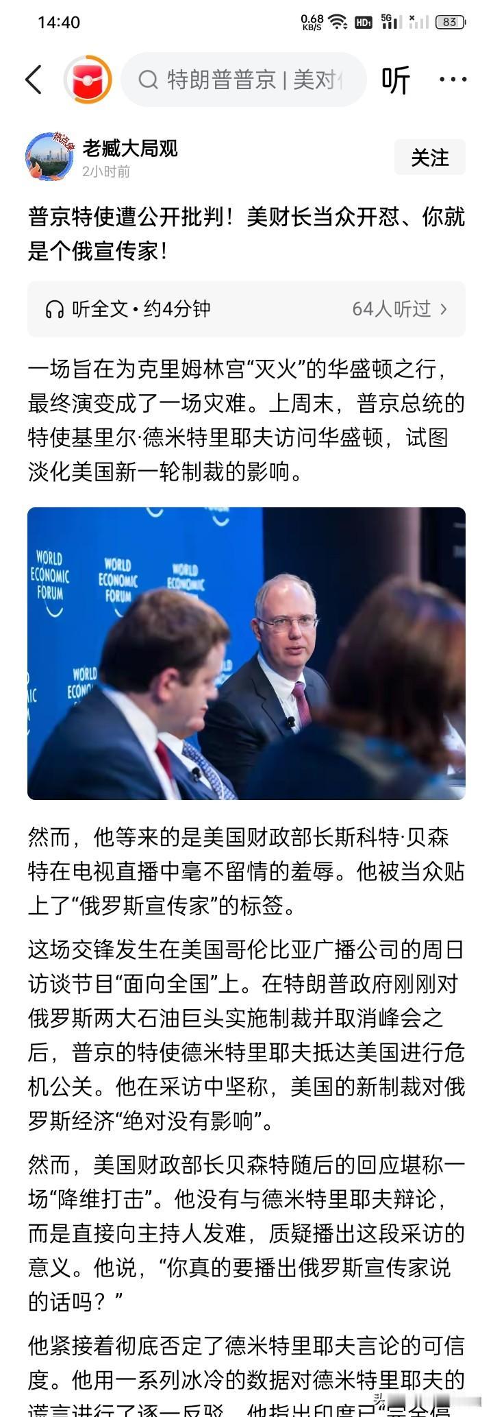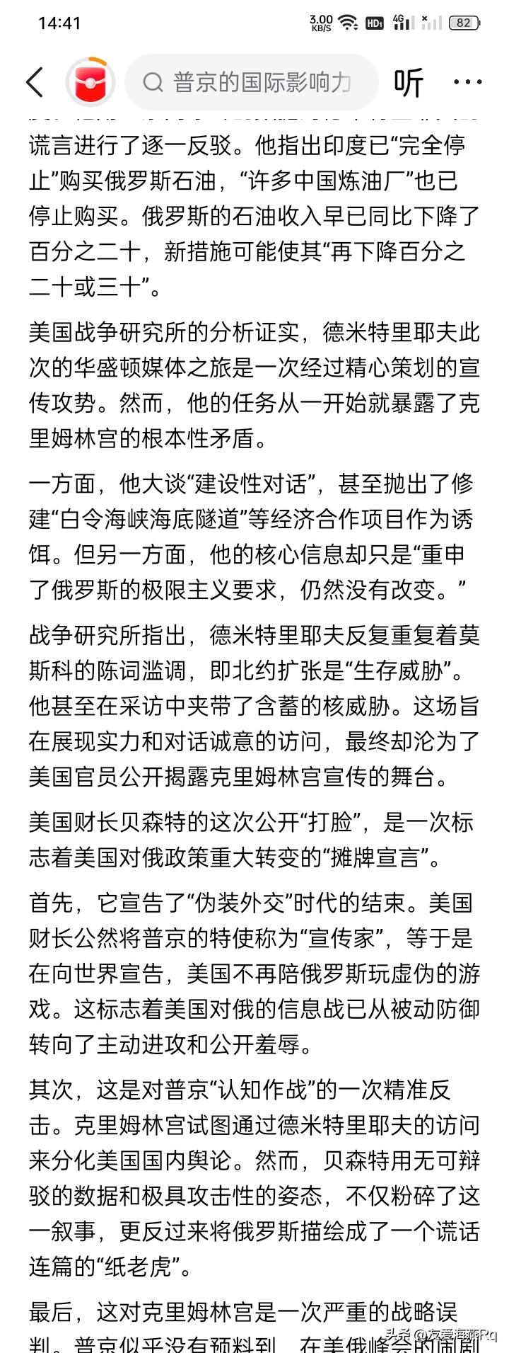 偷鸡不成,蚀把米? 俄罗斯特使德米特里耶夫,是在美国宣布对俄罗斯最大的两家石油公司进行严厉制裁,匈牙利的元首会晤取消后访问美国的。他大概就是去沟通协调、甚至是妥协、灭火的。 然而,德米特里耶夫在美国的努力,被美国财政部长贝森特直言不讳的称之为“俄罗斯的宣传家”。据有消息说,德米特里耶夫在美国称,美国对俄罗斯石油公司出口石油的严厉制裁,对俄罗斯的经济“绝对没有影响”。这话显然不符合实际情况,因为俄罗斯总统普京似乎对于美国的对俄罗斯出口石油的制裁的情况说过:问题很严重,但不会对俄罗斯的经济产生重大影响。到了德米特里耶夫这里,就成了“绝对没有影响”。而美国财政部长贝森特表示,这次对俄罗斯最大的两家石油公司的制裁,可能让俄罗斯的石油出口数量在之前的情况下,再减少20-30%的出口量。 总之,德米特里耶夫特使的这趟美国之行,似乎很有点偷鸡不成,蚀把米的样子,好像远远不及一通电话。但是,电话这个看不见的桥梁,大概也断塌了,大概率基本上没人接电话了。