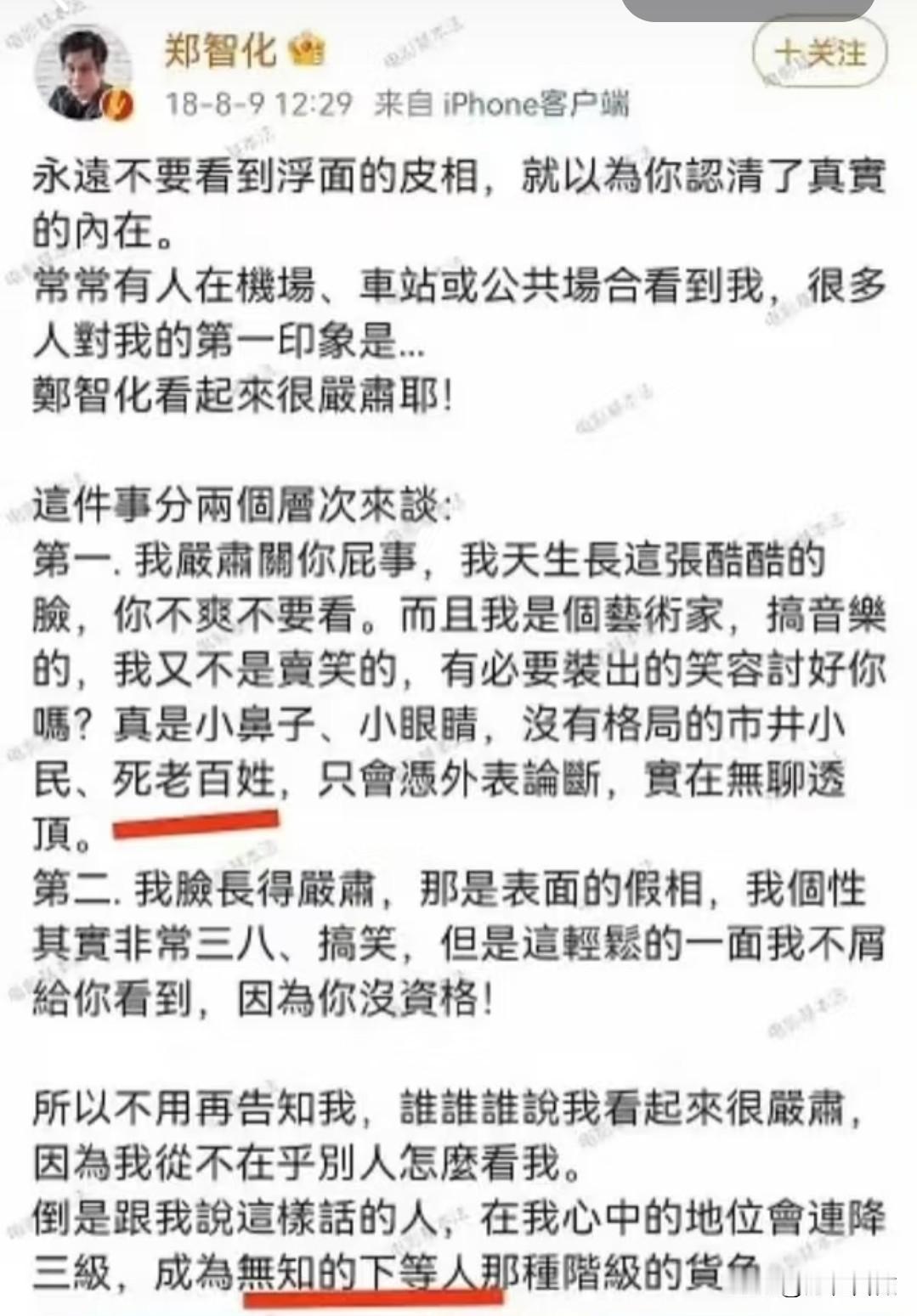 郑智化吐槽机场服务 我真的不意外 因为早在2018年,他就曾经怒怼说他长相严肃的人,还把他们分为下等人。 因为网友粉丝说他在公共场合表情严肃,其实这样不算什么贬义词吧。 可他倒好,把这么个小事儿还分成两个层面来说。先说自己其实不严肃,回怼网友是死老百姓,没有格局。再说别人没资格评判他。 最后还说这么说他的人在他心中是下等人,也就是说在他心里,自己就是高等人咯。 那么在他认知中,高等人在机场就应该受到高等人的对待呗,真不知道他是怎么想的。