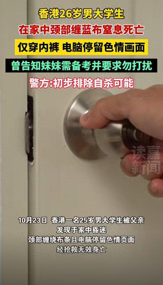 太揪心了!香港一名大二学生,竟在房间里用布条缠颈,看色情片时窒息身亡,两天后才被家人发现!电脑屏幕还停留在低俗页面,脖子上的蓝布勒痕触目惊心! 更让人脊背发凉的是,这和16年前重庆“红衣男孩”的离奇死因如出一辙,那么这名大学生死前经历了什么?是自杀还是他杀呢?如今,警方回应来了,我们一起来看! 综合光明网等媒体报道,10月23号傍晚,香港葵涌葵俊苑的黄先生因为两天没见到儿子,强行打开房门后当场崩溃:26岁的儿子仅穿内裤倒在地上,颈部缠着蓝色布条,电脑还亮着色情网站页面,人早已没了生命迹象。 警方初步排除自杀。可网友一眼点明关键,说他这是在追求“窒息快感”,一种靠缺氧增强刺激的危险行为,此前,美国也有年轻人因模仿类似情节丧命。而早在2009年,重庆13岁的“红衣男孩”也是以类似方式死亡,警方最终认定为性窒息意外,当时还因诡异场景引发过很多猜测。 消息一出,网友们瞬间炸开了锅!有网友表示:“以为是小说里才会出现的故事情节,没想到真有人拿命试,这就是性教育缺失的代价!” 还有网友表示:“这哪是什么‘快乐’,这就是拿生命换刺激,大脑缺氧时根本没办法自救! ”说白了,这场悲剧根本不是“色字头上一把刀”,而是“无知头上一把刀”!所谓的“窒息快乐”,其实是极度危险的性窒息行为,靠勒颈缺氧产生快感,但大脑对缺氧极其敏感,稍微没控制好就会昏迷丧命,而且独自操作时连求救的机会都没有! 更讽刺的是,家长的“缺位”不止在教育上。这孩子和家人同住,说要“备考”闭门两天,家人就真的全程不打扰,直到发现时已回天乏术。16年前重庆“红衣男孩”的父母也是常年在外打工,让孩子独居,最后连孩子有异装倾向都不知道。 这哪是“尊重隐私”,分明是监护失职!不要别再把性教育当成“洪水猛兽”了!学校羞于讲、家长不愿提,孩子只能偷偷从低俗内容里找答案,可这些内容只会放大猎奇心理!性不是不能提的禁忌,无知才是真的杀手。 希望这起悲剧能撕开性教育的遮羞布,别再让年轻人用生命为“缺位的课堂”买单!