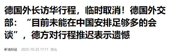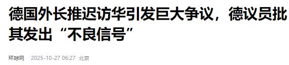 难怪德外长取消访华,临行前接到北京要求,德抱怨称这是大国对小国的做法! 柏林时间 10 月 24 日,德国外交部突然宣布外长瓦德富尔推迟原定两天后开启的首次访华行程。 这则看似普通的外交日程调整,却在欧洲政坛掀起不小波澜。 德媒用 “超级外交灾难” 形容此次事件,英国《金融时报》更直言这是默茨政府执政以来最严重的外交挫败。 德国外交部给出的理由是 “未能在中国安排足够多的会谈”,但熟悉中德外交惯例的观察家都清楚,这不过是外交辞令的 “体面说法”。 作为欧洲最大经济体和中国在欧盟的第二大贸易伙伴,中德每年保持着近 80 个对话机制的高频互动,仅 2025 年前三季度双方就举行了五次部长级会晤。 所谓 “会谈不足” 的借口,显然难以服众,其实真正的导火索在于瓦德富尔临行前的一系列不当言论。 这位来自基民盟的外长在接受路透社采访时,不仅对中国稀土出口管制指手画脚,更在台海问题上抛出 “战略模糊” 论调,声称德国将 “自行决定一中政策的实施方式”。 这种挑战中国核心利益的言论,立即招致中方严厉驳斥。 外交部发言人郭嘉昆明确指出,一中原则没有任何 “自定义” 空间,要求德方停止在错误道路上越走越远。 瓦德富尔延续了前任贝尔伯克的 “说教模式”,以“大国对小国”的口吻,试图用意识形态标准评判中德关系,却忽视了德国自身的脆弱性。 德国《焦点》周刊尖锐批评道,这种 “教师爷” 做派不仅无助于解决问题,反而会让德国在关键领域受制于人。 正如中国现代国际关系研究院专家孙恪勤所言,德国经济已停滞三年,若中德经贸再受冲击,制造业将面临 “难以承受之重”。 此次事件是德国内政博弈的缩影,执政联盟中的社民党与总理默茨所在的基民盟,在对华政策上存在深刻分歧。 社民党议员阿赫梅托维奇公开批评外长 “发出不良信号”,呼吁以 “对话与长远利益” 重构对华战略;而基民盟强硬派仍坚持 “价值观外交”,试图在台海等问题上向中国施压。 这种内部分裂在瓦德富尔原定访华团名单上表露无遗 —— 德国工业界代表团集体缺席,被解读为企业界对现行政策的不信任投票。 作为欧盟核心成员国,德国既要维护跨大西洋联盟,又不愿完全倒向美国的对华遏制战略。 默茨政府提出的 “去风险” 政策,本质上是在中美之间寻求平衡,但这种骑墙策略在实际操作中往往顾此失彼。 北京外国语大学教授崔洪建指出,德国尚未形成清晰的对华战略框架,政策摇摆不定导致外交行动屡屡受挫。 不过尽管存在分歧,双方仍有着深厚的共同利益。 今年前 8 个月,中德贸易额达 1634 亿欧元,中国重新超越美国成为德国最大贸易伙伴。 这种紧密的经贸联系,为双方关系提供了 “压舱石”。 正如外交部发言人所言,中德作为世界主要经济体,应为塑造新型大国关系做表率,坚持相互尊重、平等相待。