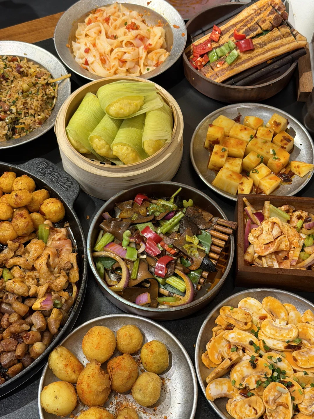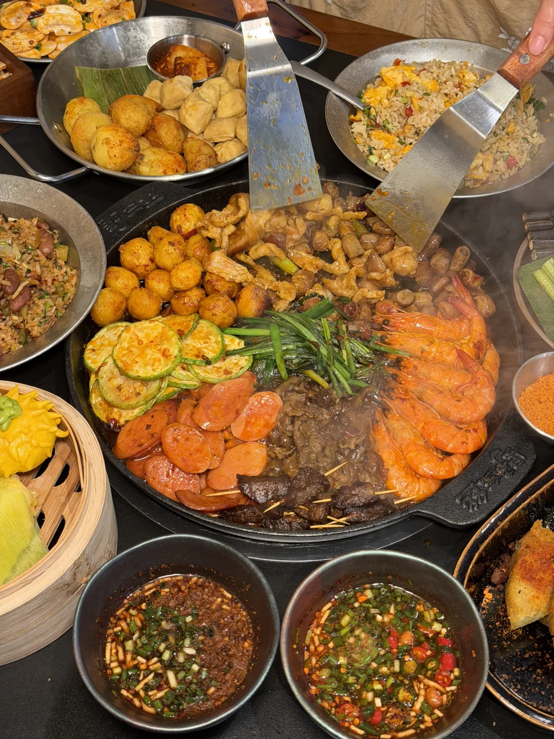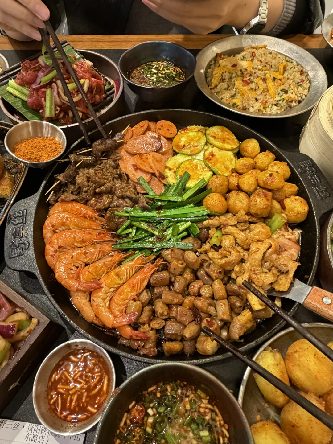下高铁直接去吃野三丝贵阳铁板烧!!锅底我们点的贵州香辣,食材都是提前码过料的,只用点好喜欢的荤素菜,摆满一锅就开整!!个人比较推荐👉安顺小肠、荤三丝、薄荷牛板腱!在铁板上炒熟后可以盖在脆哨炒饭上,真的jujuju好吃😍😍!!! 还有很多贵州特色小吃,像是洋芋粑粑、毛辣果拌米皮…都值得吃!!甜品也有水果泡芙和冰浆,4个人吃下来人均70多,安利给所有在贵阳的人😭😭!!!