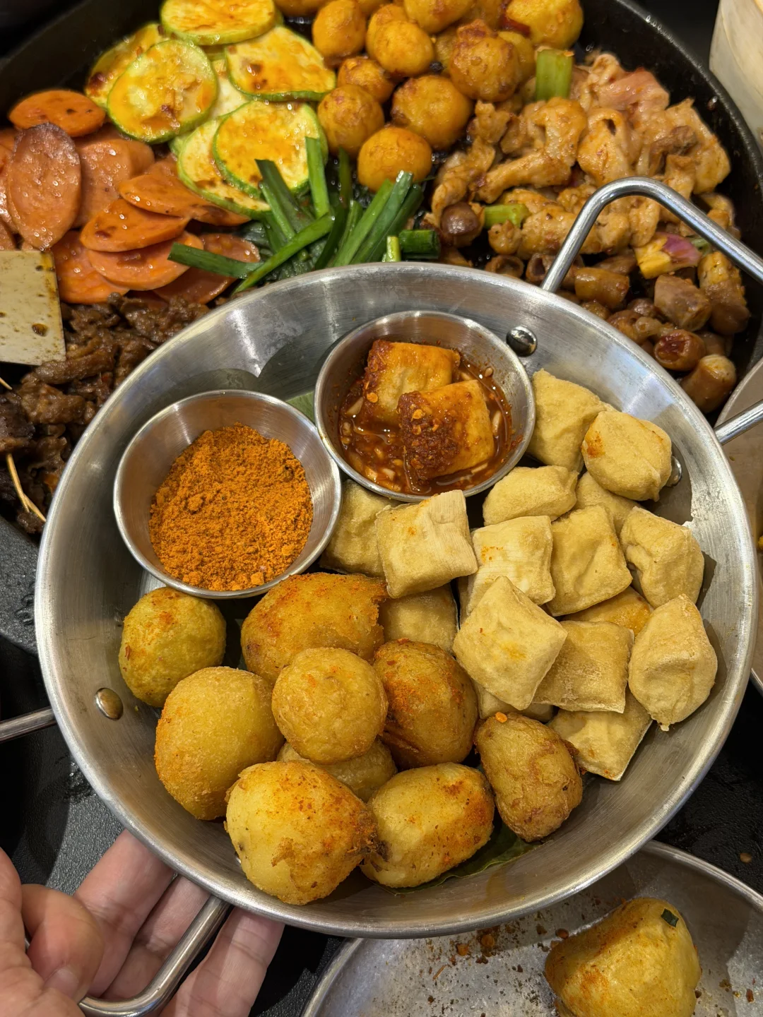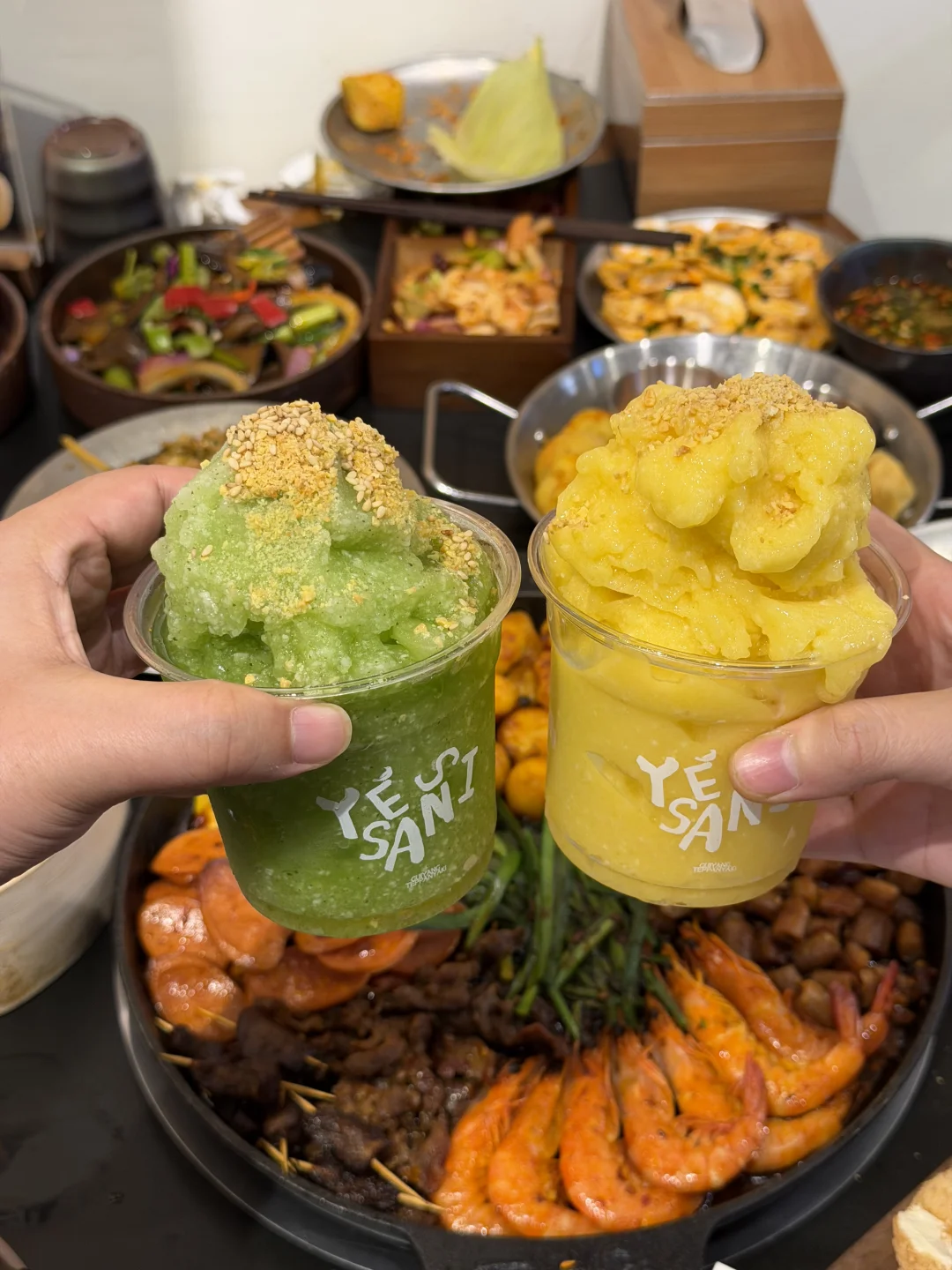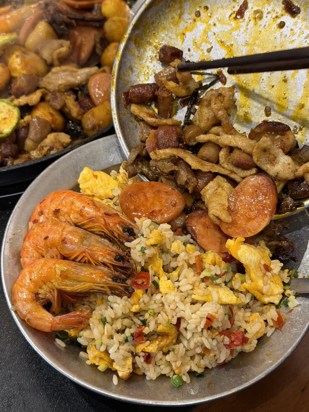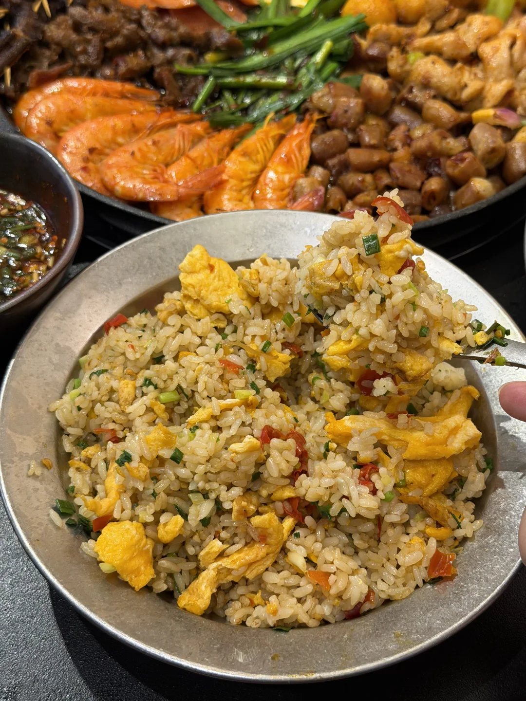 下高铁直接去吃野三丝贵阳铁板烧!!锅底我们点的贵州香辣,食材都是提前码过料的,只用点好喜欢的荤素菜,摆满一锅就开整!!个人比较推荐👉安顺小肠、荤三丝、薄荷牛板腱!在铁板上炒熟后可以盖在脆哨炒饭上,真的jujuju好吃😍😍!!! 还有很多贵州特色小吃,像是洋芋粑粑、毛辣果拌米皮…都值得吃!!甜品也有水果泡芙和冰浆,4个人吃下来人均70多,安利给所有在贵阳的人😭😭!!!