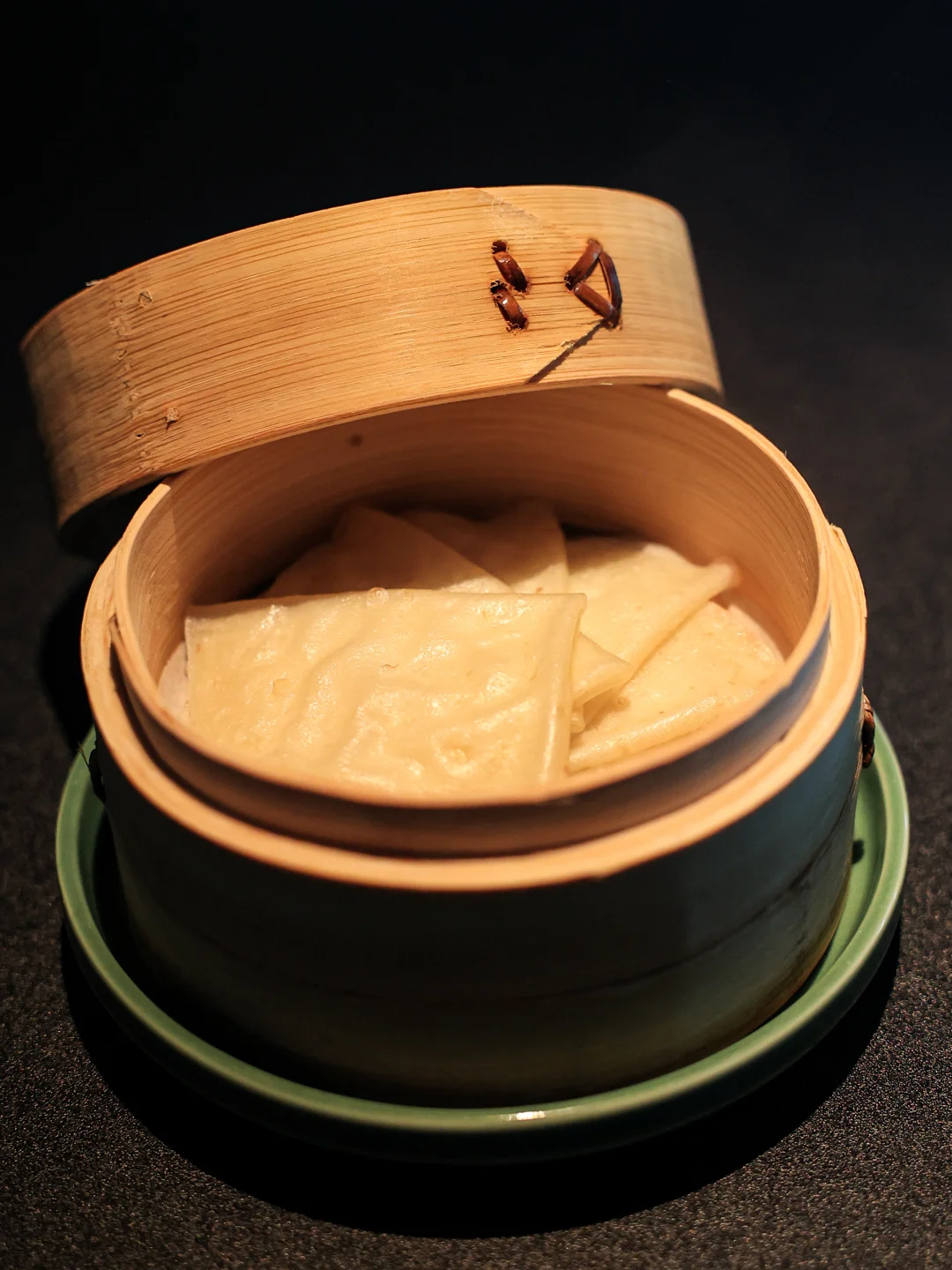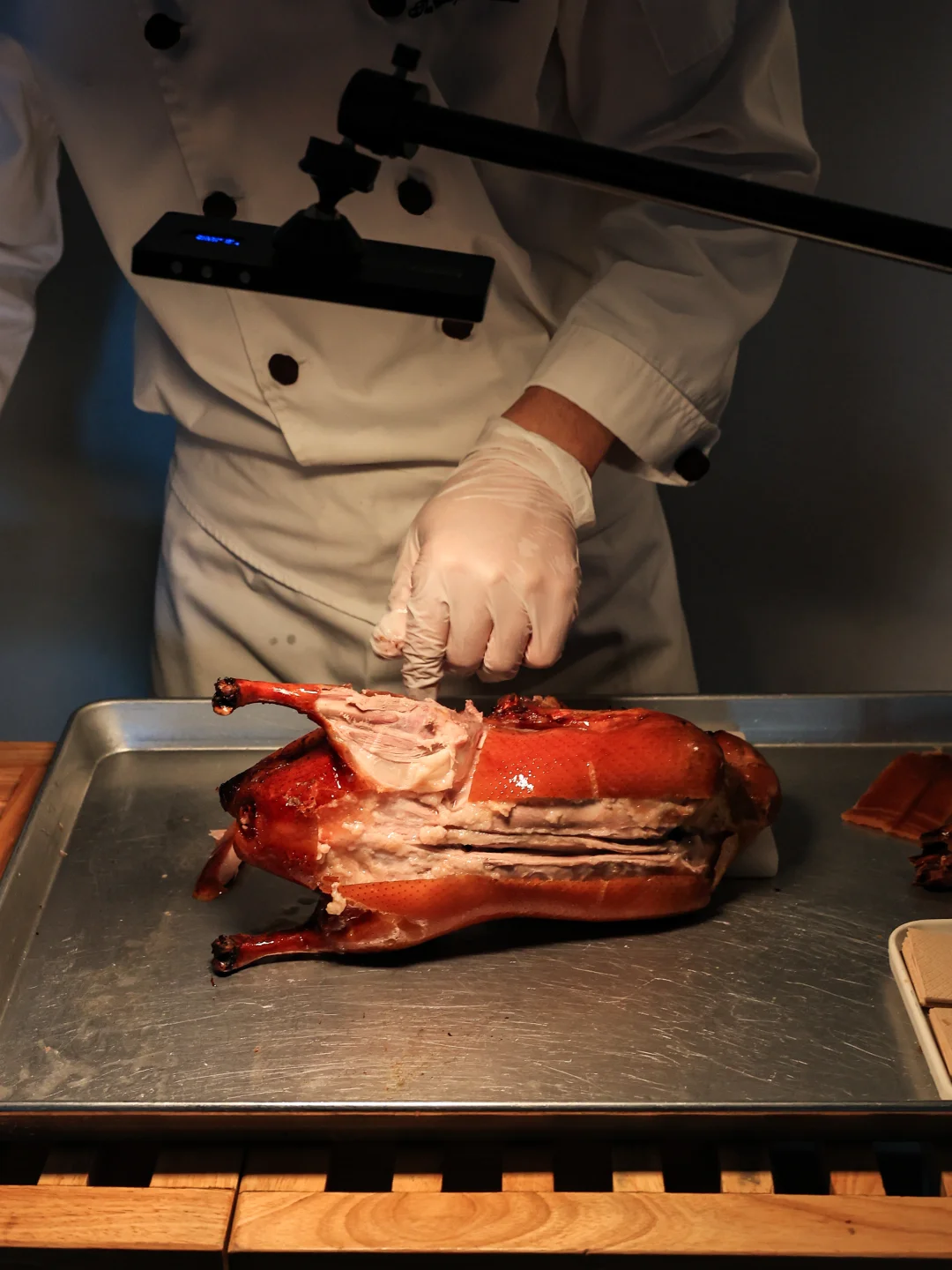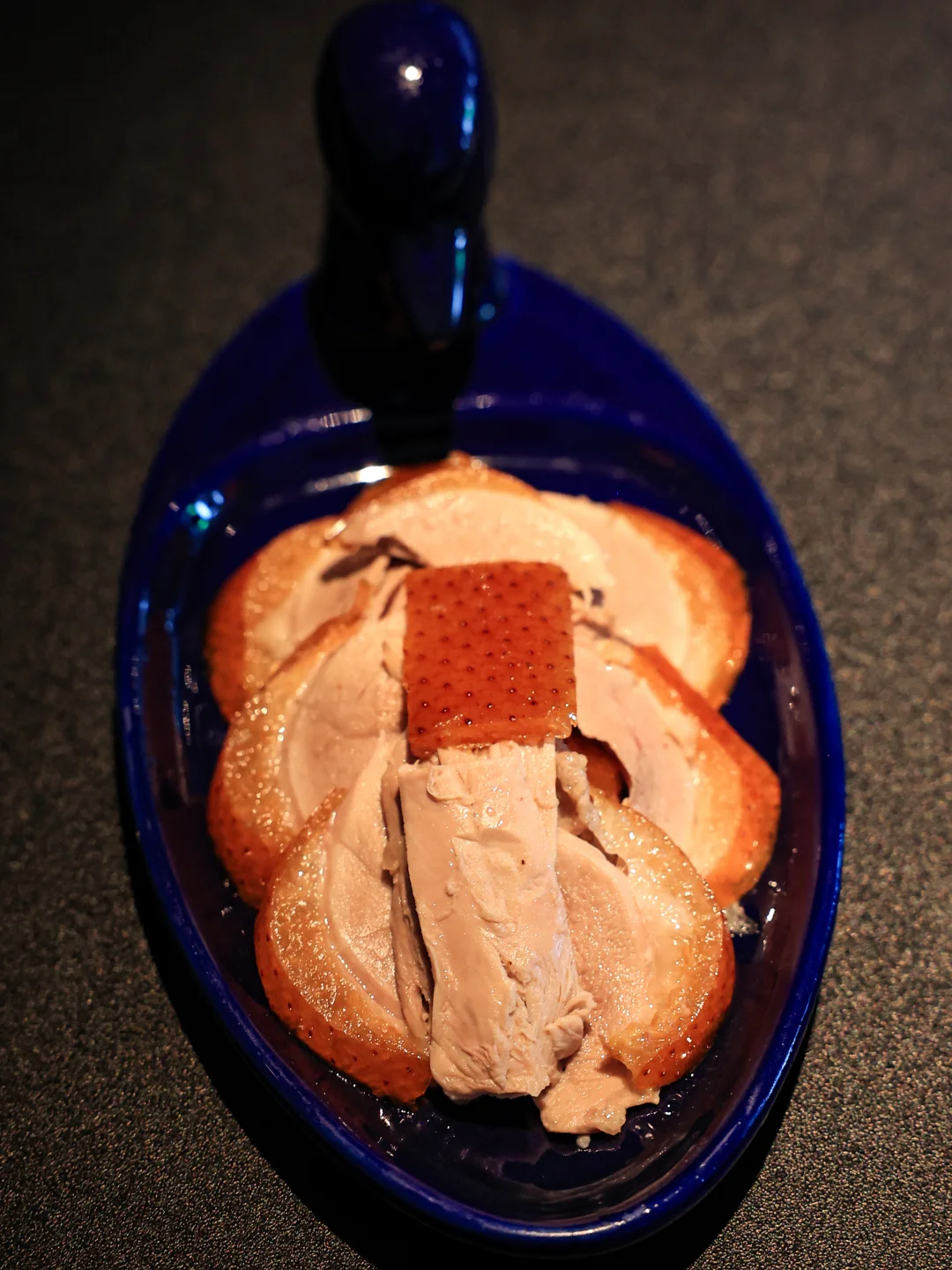 片好的鸭,会先上来两块盖鱼子酱的版本,底下则是垫的北方馒头。餐厅这道招牌菜用的鱼子酱会非常咸,因此凸显得鸭皮丰盈的油脂感与酥脆程度更上一层楼。
