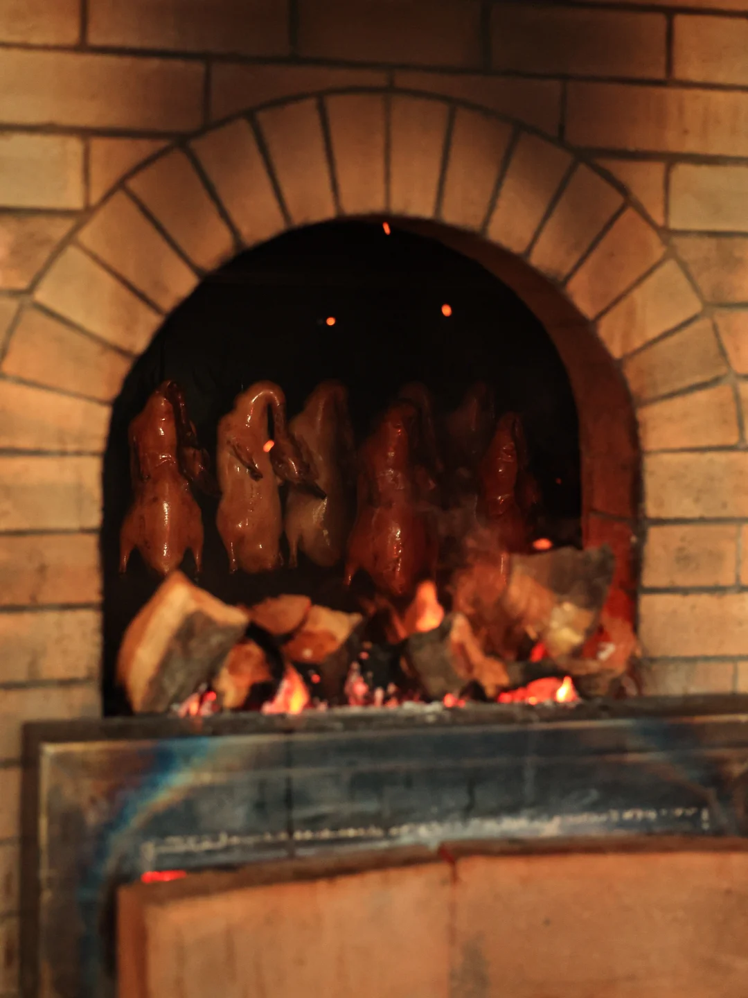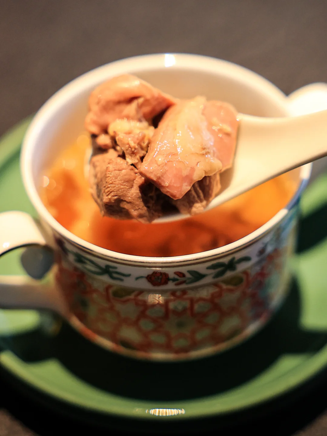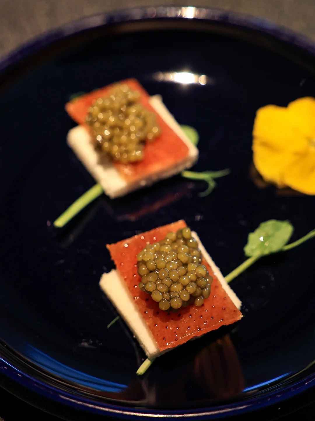 片好的鸭,会先上来两块盖鱼子酱的版本,底下则是垫的北方馒头。餐厅这道招牌菜用的鱼子酱会非常咸,因此凸显得鸭皮丰盈的油脂感与酥脆程度更上一层楼。