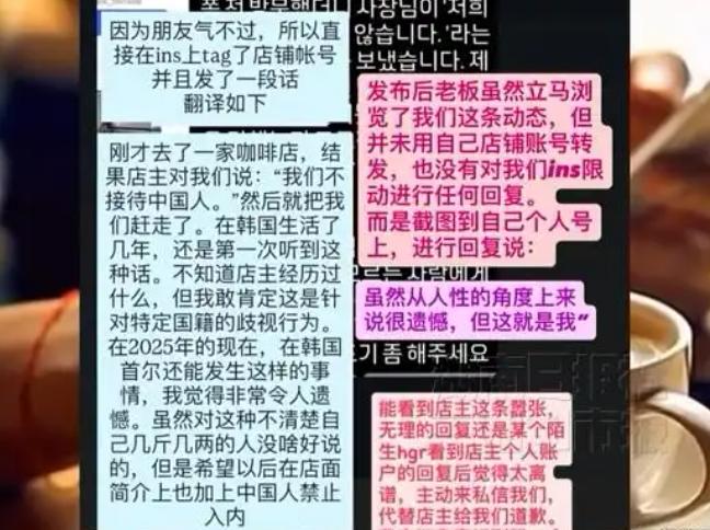 这种店离倒闭没多远了!10月22日,中国游客去韩国一咖啡厅,结果得知她是中国人后,竟然将她们直接赶了出去,并表示她们不接待中国人,甚至还在店铺门口,贴上不招待中国顾客。眼见事情闹大,咖啡店老板却不以为然,仍然强硬表示:我们很抱歉,但我们就是不接待中国顾客! 10月22日,几位中国游客走进首尔圣水洞一家装修精致的咖啡厅,他们像普通顾客一样点单、付款,准备找个舒适的位置坐下来休息,谁知道,刚坐下没多久,就在几位游客用中文说话的时候,店主就走过来,用英语告诉她们:这里不接待中国人。 这突如其来的驱让在场的人都愣住了,游客们表示已经付了钱,想知道为什么要赶她们走,店主含糊其辞地说什么以前有中国顾客惹过麻烦,但具体是什么麻烦他又说不清楚,最后店员退还了她们的钱,把人赶了出去。 更让人气愤的是,这家店门口的玻璃上赫然贴着英文告示:抱歉,我们不接待中国顾客,这张告示看起来已经贴了有一段时间了,说明这不是临时起意,而是店家的经营策略。 事情曝光后网们扒出了更多信息,原来这家咖啡厅在社交媒体的账号简介里,也明目张胆地写着不接待中国顾客,讽刺的是,这家店之前还是个网红打卡地,不少中国博主都推荐过,为它带来了不少人气,现在倒好翻脸不认人了。 面对舆论压力店主的态度依然强硬,他在评论上说道:从人性角度看确实遗憾,但这是我的选择,他拒绝撤下告示也不愿意道歉,一副爱来不来的架势。 这事儿一出,中驻韩国大使馆立刻发声,反对任何形式的歧视行为,提醒在韩中国公民注意维护自身权益,不少韩国网友也看不下去了,觉得这种行为太丢人,损害了韩国的国际形象。 说起来中国游对韩国旅游业的贡献可不小,数据显示中国游客在韩国的人均消费和总消费占比都名列前茅,特别是疫情后经济恢复期,中国游客更是韩国商家的重要收入来源,明洞、圣水洞这些商圈,很多店铺都靠中国游客养活。 附近一家礼品店老板就说得很直白:做生意的谁不知道,中国游客消费能力强,对我们来说就是财神爷,这家咖啡厅的做法,简直是自断财路。 其实韩国法律这种行为是有明确规定的,《公平交易法》里写得清清楚楚,经营者不能因为国籍、种族等原因歧视消费者,这位店主的做法,不仅道德上站不住脚,法律上也说不过去。 这件事反映出的问题值得深思,在全球化的今天各国人民交流频繁,相互尊重应该是最基本的准则,一家小小的咖啡厅,竟然敢公开搞歧视,这种狭隘的思维实在让人无语。 做生意讲究的是和气生财,来的都是客,您说这店主图什么呢,韩国咖啡厅那么多少您这一家,中国游客照样有地方喝咖啡,但您这么一搞不仅自己的生意黄了,还给整个商圈抹黑给韩国旅游业添堵。 希望这样的事情不要再发生了,这个世界需要的是理解和包容,而不是偏见和歧视,那些还抱着狭隘思想的人,早晚会被时代淘汰。 麻烦看官老爷们右上角点击一下“关注”,既方便您进行讨论和分享,又能给您带来不一样的参与感,感谢您的支持!