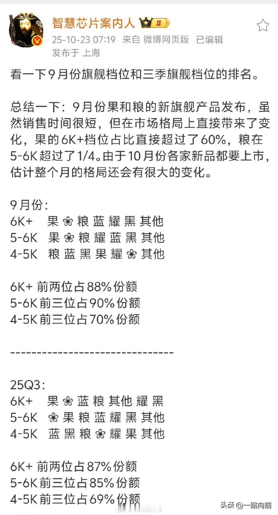 或许你会抬杠,但这就是赤裸裸的现实! 手机高端旗舰市场,苹果华为还是牛逼。 在华为回归之后,有的厂商高端就注定成不了了。 最新的高端手机市场数据,才明白啥叫“神仙打架,凡人退散”!6000元以上的高端市场里,苹果一家占了65.81%,华为稳拿24.38%,俩品牌加起来快垄断90%的份额,剩下的小米、OPPO、vivo等所有厂商,只能分食那点零头,最高的小米也才2.81%。华为一回归,高端市场直接变成苹果和它的“二人转”,其他厂商的高端梦怕是真要凉了! 先说说这俩巨头的“护城河”有多深,根本不是靠堆料能追上的。苹果就不用说了,A系列芯片+iOS系统的组合拳打了十几年,流畅度和生态封闭性至今没对手,高端用户一旦用习惯,换机时十有八九还选iPhone。更狠的是品牌溢价,就算iPhone 17被吐槽“挤牙膏”,首发日照样排大队,这就是多年攒下的用户信任。 华为的底气则全在“自研硬实力”上。麒麟芯片回归、鸿蒙系统不断迭代,现在连三折叠屏手机都能量产,这些都是其他厂商拿不到的“独家技能”。高端用户买的从来不是参数,而是“人无我有”的体验——比如华为的卫星通信能救急,鸿蒙的多设备互联能提高效率,这些靠采购供应商零件的品牌根本做不到。之前华为被制裁时,其他厂商还能靠“平替”抢点份额,现在华为回来了,这条路直接被堵死。 再看其他厂商的高端化有多“尴尬”。小米喊了好几年“对标苹果”,高端机销量确实涨了,但核心问题没解决:芯片靠高通,系统改安卓,连影像算法都要靠和徕卡合作,没有自己的核心技术护城河。之前骁龙888芯片发热翻车,直接把小米11的口碑砸了,这种“看供应商脸色”的高端化,根本站不稳脚跟。 OPPO、vivo的处境更难。Find X系列、X Fold系列堆了最好的屏幕、镜头,价格也提到6000+,但消费者记住的还是“线下走量王”的标签。高端市场拼的是“技术叙事”,苹果讲“生态闭环”,华为讲“自主创新”,而它们能讲的只有“参数堆料”,这在高端用户眼里根本没吸引力。荣耀更可惜,曾经靠“华为平替”火过一阵,现在华为本尊回来了,连CEO都离职了,高端份额直接跌到1.58%。 其实关键问题就俩:一是没核心技术,二是缺品牌沉淀。高端用户花大价钱买手机,要么图苹果的“省心流畅”,要么认华为的“技术情怀”,没人会为“组装起来的高端”买单。之前华为被制裁时,苹果一家独大,其他厂商还有点机会;现在华为回归,直接把高端市场的门槛拉高了——没有自研芯片、没有独立生态、没有品牌故事,根本挤不进来。 看看数据就更直观了:2024年华为高端份额从21.4%涨到30.7%,苹果从61.8%降到51.1%,而小米、荣耀这些品牌的份额基本没动,还是4%左右。这说明华为抢的主要是苹果的份额,其他厂商连汤都喝不到。以后再想冲击高端,怕是只能在折叠屏这种细分领域抢点残羹剩饭,但折叠屏市场华为也占了近50%的份额,哪有那么容易。 讲真,高端市场从来不是“涨价就能进”的。苹果靠几十年的生态积累,华为靠实打实的自研突破,这俩巨头已经把路堵死了。其他厂商要是还只靠堆料和营销,高端化注定是空想。