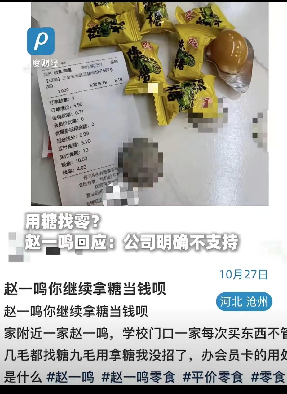 赵一鸣用糖找零翻车!9毛找7颗糖+1颗鹌鹑蛋,官方急发声:这操作违法! 谁逛超市没遇过“零钱刺客”?河北网友去赵一鸣零食花10块买东西,应付5.1元该找4.9元,结果到手4个硬币+7颗陈皮糖+1颗鹌鹑蛋,9毛钱全用零食抵了😂 网友吐槽“几分钱的糖按一毛算,这不是反向薅羊毛吗”,这事直接冲上热搜! 其实不少人都有同款经历:结账时店员一句“没零钱了,拿两颗糖凑数吧”,多数人嫌麻烦就默认了。但这次赵一鸣门店有点离谱,不管几毛都用糖抵,甚至九毛也不例外。好在官方很快回应:公司明确禁止强制用糖找零,得顾客同意才行,违规门店要整改 ! 重点来了!别觉得几毛钱小事,这操作其实涉嫌违法👉《人民币管理条例》规定必须用法定货币找零,糖果根本不能当钱用,还侵犯了消费者的选择权和公平交易权 。下次再遇到这种事,直接大胆说“不”,要求给现金,不同意就能投诉维权~ 你有没有被超市用糖、创可贴之类的东西找零过?遇到这种情况你会忍了还是直接拒绝?评论区聊聊你的经历,顺便提醒身边人别吃这个亏,点赞转发让更多人知道自己的合法权益!赵一鸣用糖找零 消费者权益保护 反向抹零 超市那些事