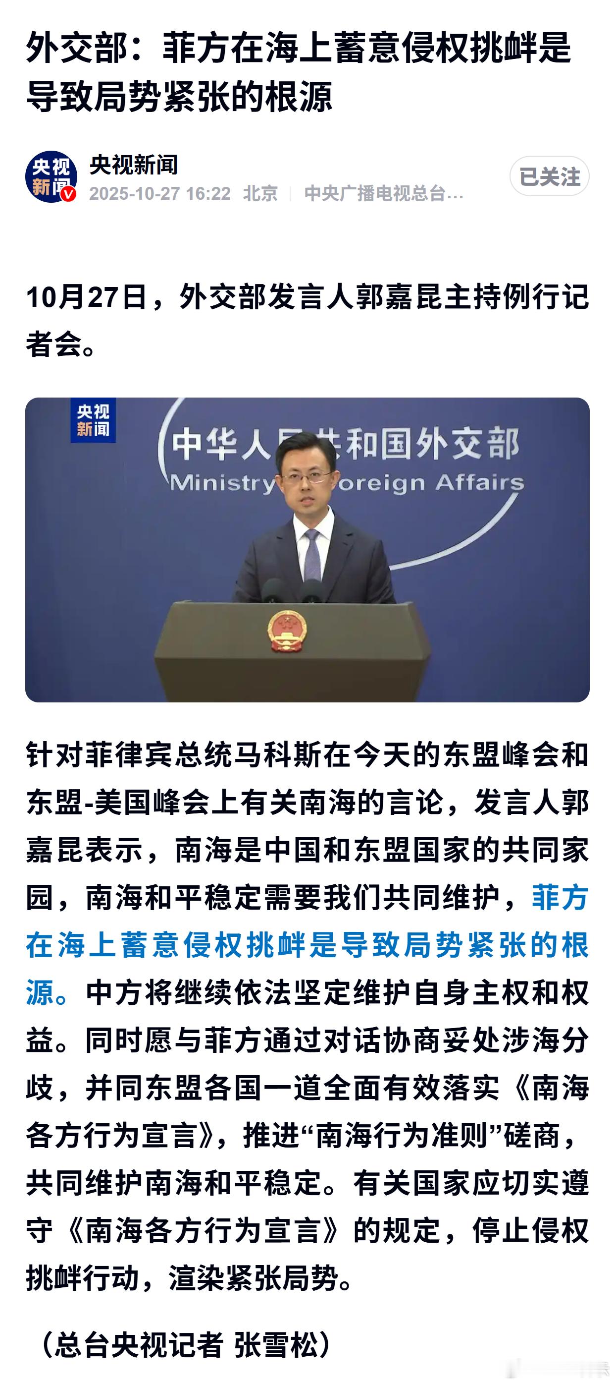 外交部:菲方在海上蓄意侵权挑衅是导致局势紧张的根源