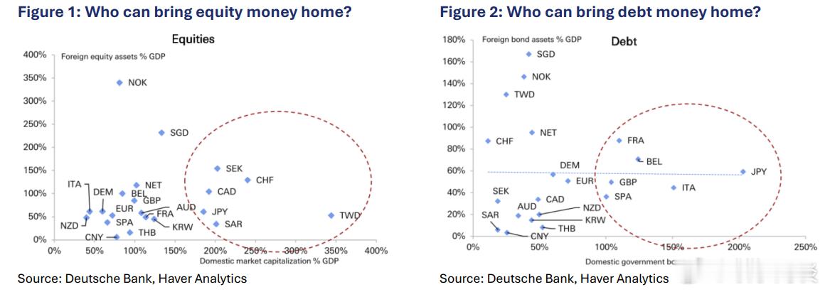 德意志银行的模型仅关注股票和债券的投资组合敞口,不包括直接实体投资。该模型还衡量这些外国资产头寸相对于一国股票或政府债券市场规模的比例。该分析与资本账户最开放的经济体最为相关。