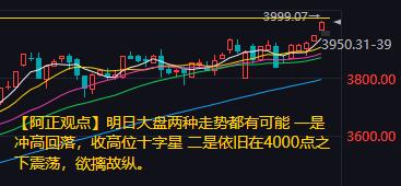 【10月27日收评:明日大盘两种走势都有可能 一是冲高回落 收高位十字星 二是依旧在4000点之下震荡 欲摛故纵】 盘前分析“今日大盘大概率高开并继续尝试上攻”、“量能持续放大,将支撑行情向上发展”、“上证指数上行的压力位先看3960-3965点区间,再看3980点附近,极限难以突破4000点”判断完全准确:市场震荡上涨,沪指高开高走涨超1%,再创十年新高,盘中逼近4000点。沪深两市成交额23401亿元,较上个交易日放量3659亿,个股涨多跌少,参与今日交易的沪深两市5153只个股中,3241只收红,涨超9%个股87只。 今日市场热点轮番活跃,板块角度看,存储芯片概念股全天走强,德明利2连板创新高,江波龙、香农芯创等多只个股创新高,时空科技4连板;算力硬件概念股延续强势,汇绿生态6天4板创新高,新易盛、中际旭创盘中均创历史新高;核电板块表现活跃,东方钽业3天2板,安泰科技等多股涨停;风电板块集体走弱,海力风电大跌。 指数表现:沪指涨1.18%,报收3996点;深成指涨1.51%,报收13489点;创业板指涨1.98%。报收3234点。 板块表现:512个板块中,468个收红,存储芯片、CPO、可控核聚变等板块涨幅居前,游戏、风电设备等板块跌幅居前。 资金表现:大盘资金全天净流出73.62亿元,其中上证净流入30.61亿,深证净流出104.2398.88亿。 两市成交:两市全天成交23401亿元,较上一个交易日成交额放量3659亿元,上证成交10434亿元,较上一个交易日成交额放量1849亿元。 明日猜想:大盘已经来到4000点关口,4000点又将是A股的一个分水岭,后续若能站稳4000点,A股将进入新阶段。4000点看似唾手可得,实则还有一番争夺。 市场需要震荡夯实,作为一个新的阶段,从市场各方利益角度,也不宜直接快速远离。所以,明日市场在突破4000点后,两种走势都有可能:一是冲高回落,收高位十字星;二是依旧在4000点之下震荡,欲摛故纵。 我写精品,你来点赞,相互支持,携手共进。 (个人观点,仅供参考,据此操作,责任自负)