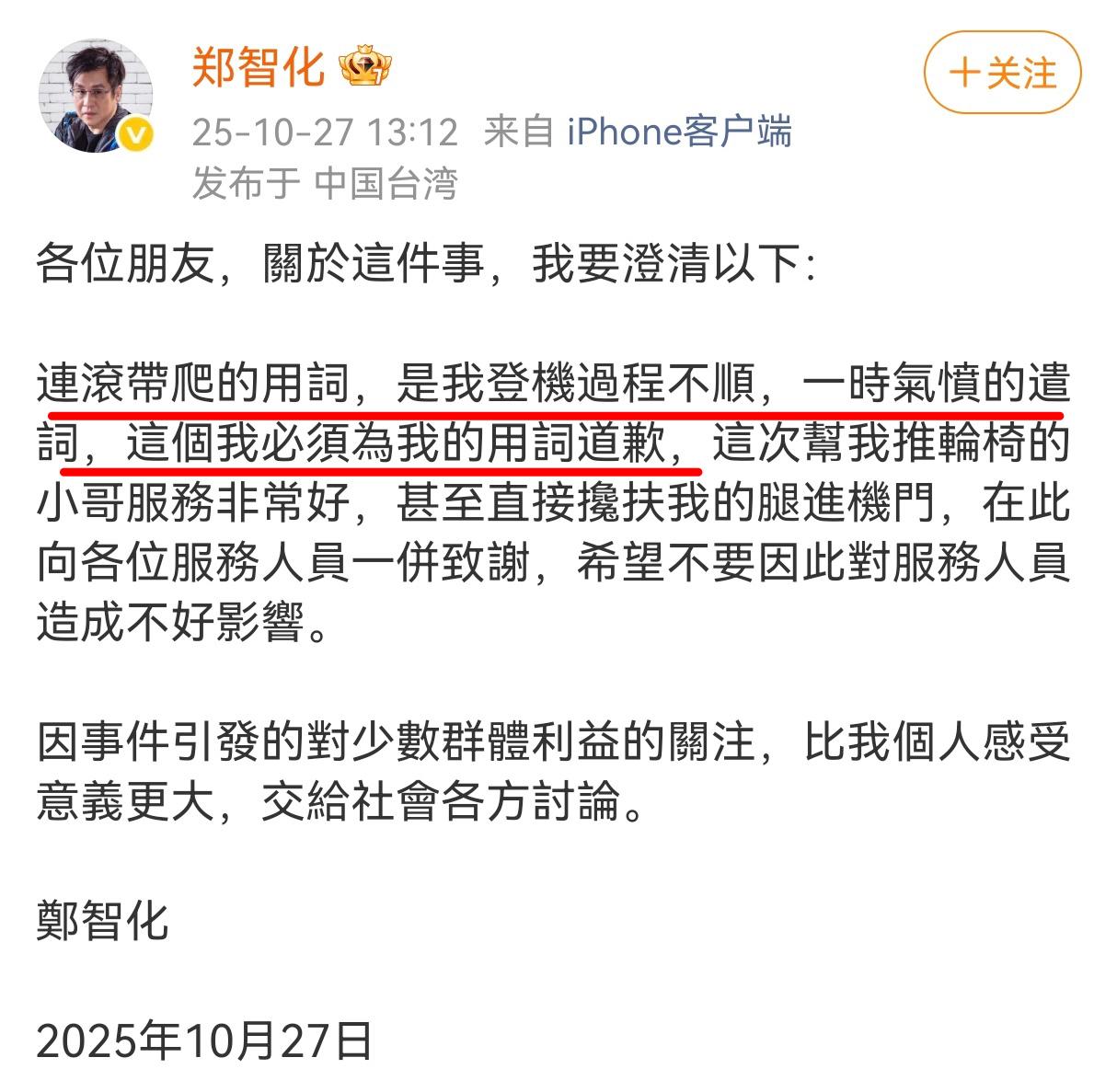 郑智化道歉了,但又没完全道歉…… 他承认自己用“连滚带爬”是一时气愤,真实情况和监控录像里一样,但他并未删除之前的文章,而且在简短的道歉后,还特意强调希望引起对少数群体利益的关注,这个意义比他的个人感受更重要,有种虽然错了但错的有价值的感觉。给郑老师一个小建议,道歉的时候能不能使用一下简体字,也算是对大陆网友的尊重。