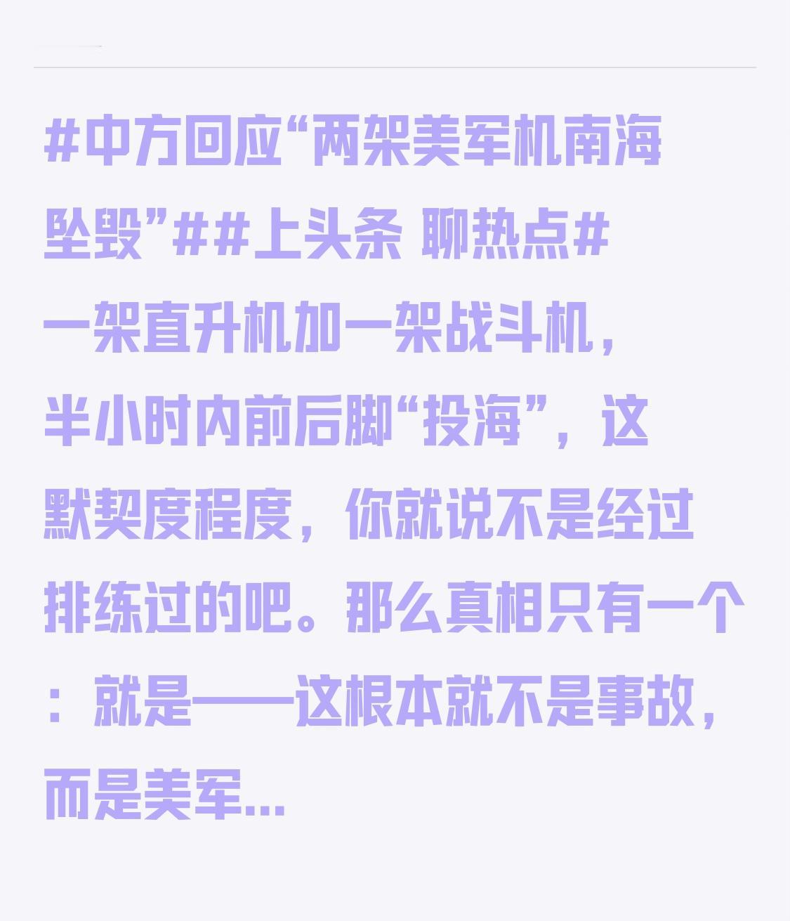 一架直升机加一架战斗机,半小时内前后脚“投海”,这默契度程度,你就说不是经过排练过的吧。那么真相只有一个:就是——这根本就不是事故,而是美军在南海进行的史上最贵“打水漂”表演,旨在向世界展示其惊人的预算燃烧能力! 在说说肇事航母“尼米兹”号是个50岁的“老同志”,眼看就要退休了。细思极恐啊同志们,这怕不就是美军为了申请新航母预算自导自演的“苦肉计”吗?