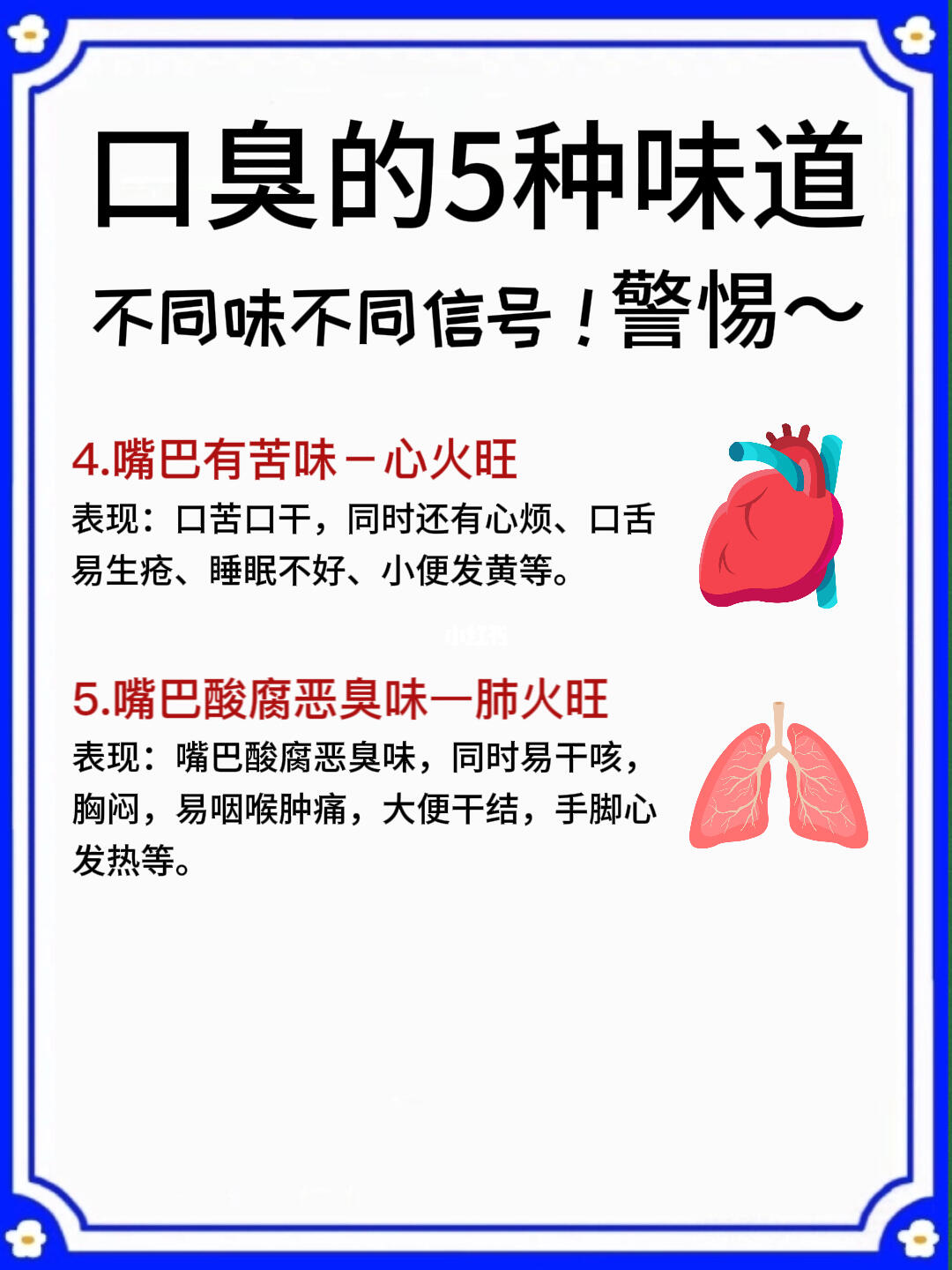 一张嘴就臭气熏天 不仅让旁人避之不及 自己也会觉得非常尴尬 长期的口臭还会给人留下不讲卫生的邋遢印象😞 . 其实,口臭也是有不同味道的! 如果你的口臭出现了以下几种味道,一定要重视起来❗ . 1️⃣嘴巴硫磺味——肝火旺 2️⃣嘴巴食物腐臭味——脾胃火盛 3️⃣嘴巴鱼腥味——肾阴虚火旺 4️⃣口苦口干——心火旺 5️⃣嘴巴酸腐恶臭味——肺火旺 (详细介绍如图所示) . 不同的味道可能代表着身体出现了不同程度的问题,是时候进行内调了✅ 丁香、橘皮、甘草、蒲公英、金银花、山楂、藿香等十余种食材,清洗干净后放入养生壶,开启花茶模式,10分钟即可~ . 💕赶快跟着喝起来!远离口臭,做个口气清新的小仙女吧~ .