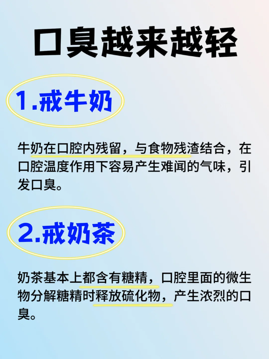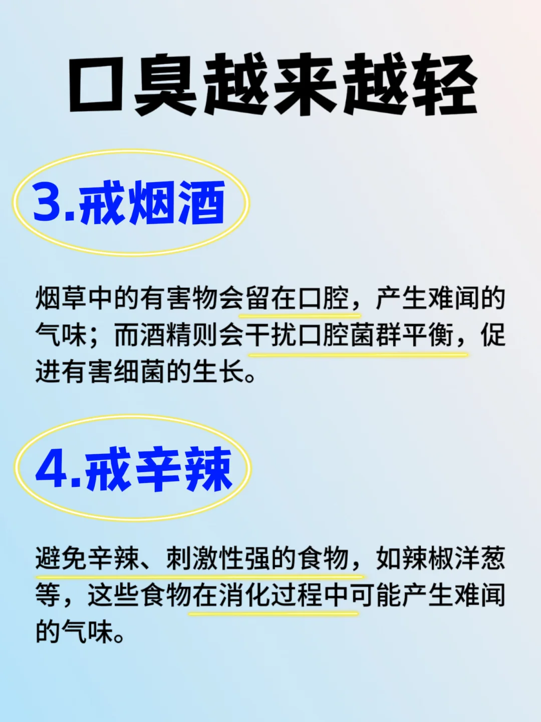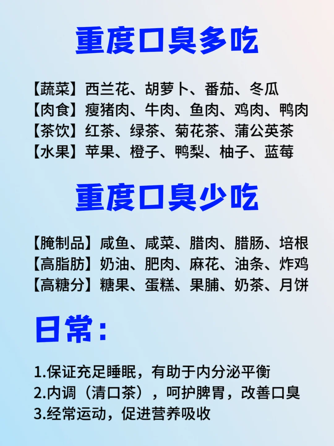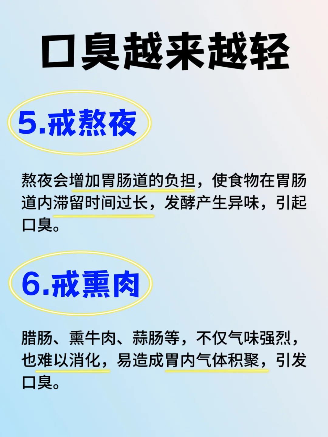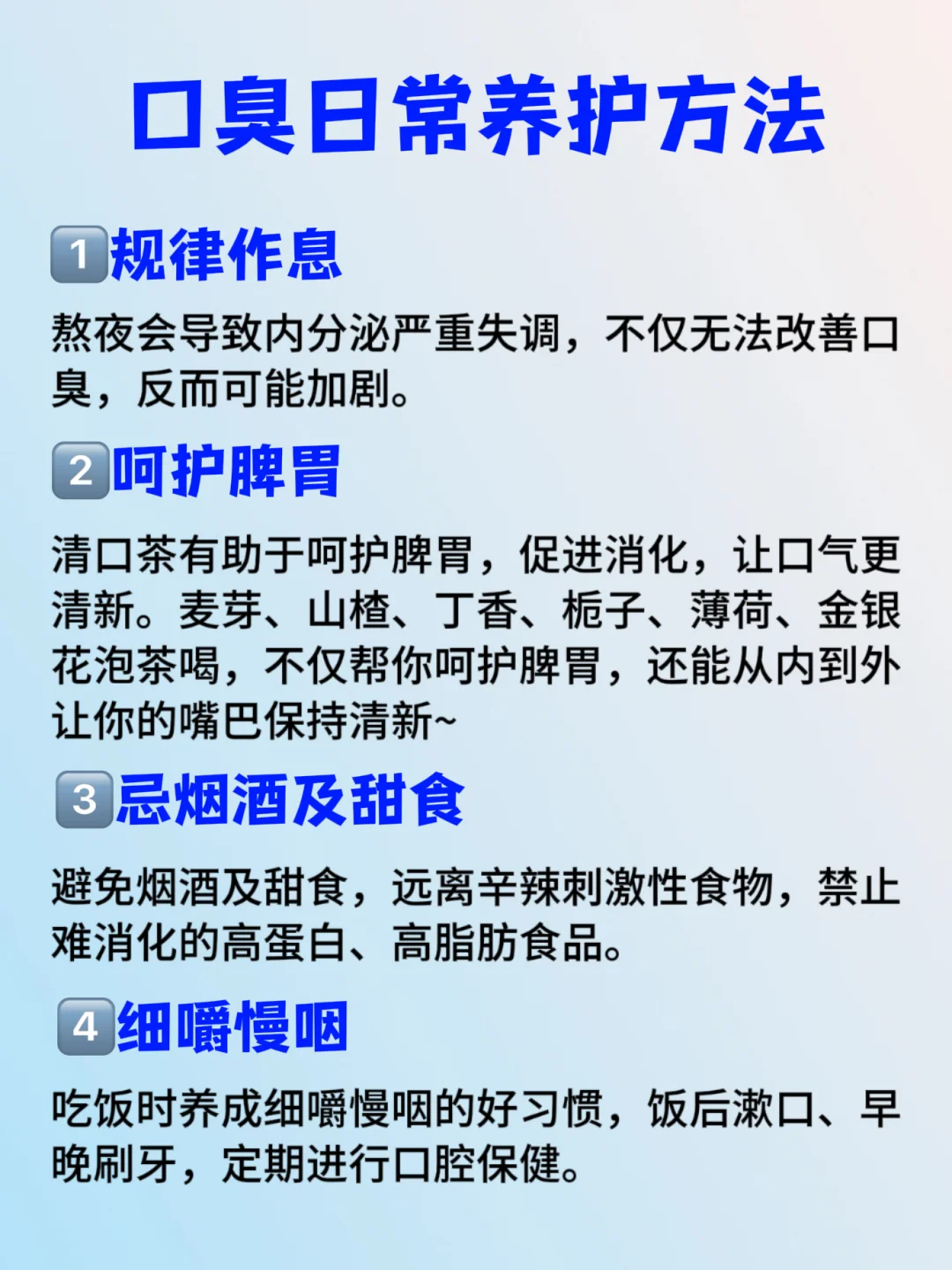 快节奏的生活使得许多年轻人生活习惯不规律,口臭问题便随之而来🔥 . 👉很多宝子因为作息不规律,偏爱油腻辛辣食物,又缺乏运动,时间一长就发现口臭缠身,一张嘴便是食物腐败的气味,不敢与人交谈,自信心也大受打击... 一 整理了口臭的相关知识,对于还不知道口臭怎么调理的宝子们,建议收藏❗ — 口臭日常养护方法✅ 1️⃣规律作息 熬夜会导致内分泌严重失调,不仅无法改善口臭,反而可能加剧。 2️⃣呵护脾胃 清口茶有助于呵护脾胃,促进消化,让口气更清新🍃 麦芽、山楂、丁香、栀子、薄荷、金银花泡茶喝,不仅帮你呵护脾胃,还能从内到外让你的嘴巴保持清新~ 3️⃣忌烟酒及甜食 避免烟酒及甜食,远离辛辣刺激性食物,禁止难消化的高蛋白、高脂肪食品。 4️⃣细嚼慢咽 吃饭时养成细嚼慢咽的好习惯,饭后漱口、早晚刷牙,定期进行口腔保健。 —
