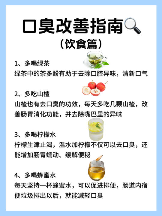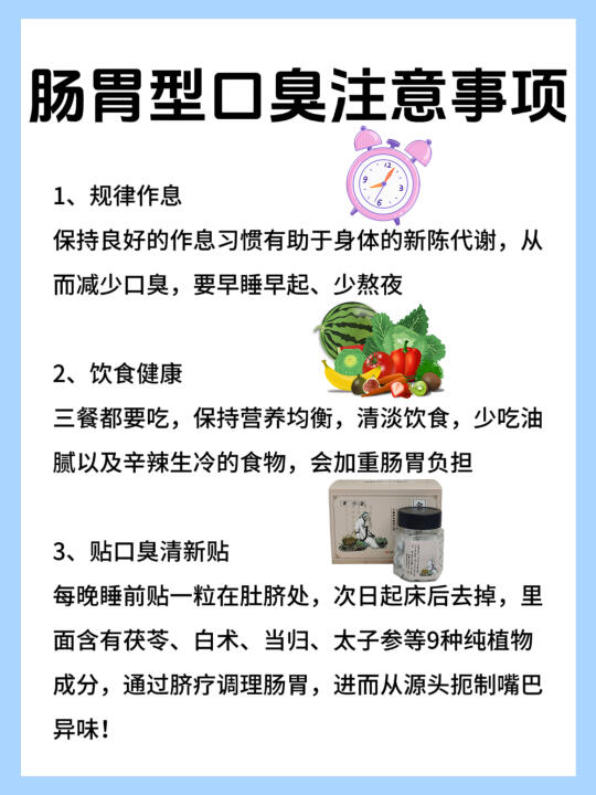 🔥很多人都是在他人提醒或无意间得知自己有口臭的,这种情况确实很尴尬,因为通常自己很难察觉到口臭…… - 👉️如今生活压力大,熬夜加班、频繁应酬、饮食不规律等行为都对身体造成伤害,尤其是肠胃。长此以往,肠胃功能出现问题,食物在食道内堆积、腐烂,其异味就会通过口腔散发出来,形成口臭…… - 💥当然,也有部分口臭是由口腔问题引起的,这种情况需要具体分析。很多人一开始并不清楚自己口臭的原因和解决办法,尤其是肠胃型口臭和口腔型口臭,很多人难以区分。图文里整理了口腔型口臭和肠胃型口臭的区别,以及改善方法,有需要的可以参考了解~ - ⚠️如何进行自查? 1、自闻口水法 2、舌苔观察法 3、自闻口水法 4、棉签刮舌法 - 口腔型口臭怎么改善❓ ✅认真刷牙 早晚刷牙,饭后漱口,用牙线清理牙缝 ✅用漱口水和喷雾 保持口腔卫生 ✅少吃重口味的食物 比如大葱、大蒜、榴莲、洋葱 ✅戒烟戒酒 - 肠胃型口臭怎么改善❓ ✅规律作息 保持良好的作息习惯有助于身体的新陈代谢,从而减少口臭,要早睡早起、少熬夜 ✅健康饮食 三餐都要吃,保持营养均衡,清淡饮食,少吃油腻以及辛辣生冷的食物,会加重肠胃负担 ✅贴口臭清新贴 每晚睡前贴一粒在肚脐处,次日起床后去掉,里面含有茯苓、白术、当归、太子参等9种纯植物成分,通过脐疗调理肠胃,进而从源头扼制嘴巴异味! - 方法就这些,不难,但要坚持,有口臭的快来接好运‼ -