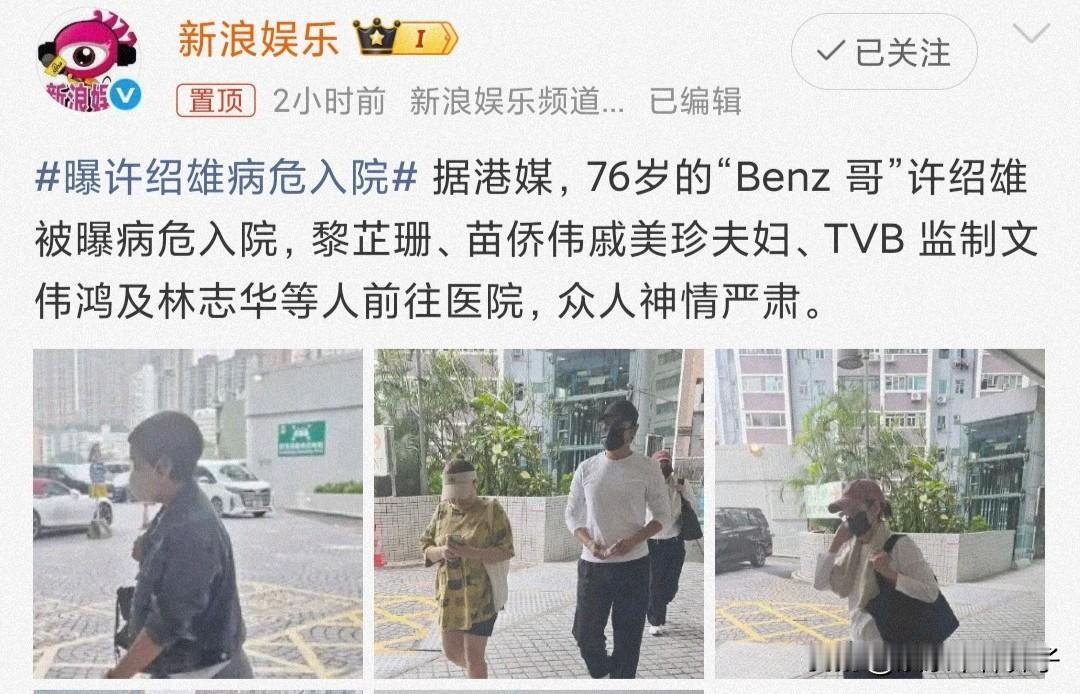 港媒这爆料不会是真的吧!多位艺人已经前往医院看望许绍雄…… 10月27日,港媒爆料76岁许绍雄病危住院,消息一出,很多网友表示担心,希望这不是真的,期盼“Benz 哥”平安无事,毕竟太多经典角色给观众留下深刻印象。 随后,媒体拍到黎芷珊、苗侨伟戚美珍夫妇以及黄宗泽等前往医院探望,而且表情凝重。 说实话,听的名字,可能觉得挺陌生,看到照片,却又如此眼熟,特别是还曾出演过《射雕英雄传》,相信很多人都看过。 不得不说,许绍雄也算实力派演员,真希望爆料不是真的,期待后续的消息。