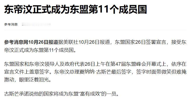 东帝汶总理流泪了! 10月26日,马来西亚吉隆坡的第47届东盟峰会开幕式现场,气氛格外热烈。当东盟十国的代表依次在接纳宣言上签字,正式确定东帝汶成为第11个成员国时,东帝汶总理夏纳纳・古斯芒再也忍不住眼中的泪水。 他站在发言台前,声音带着一丝哽咽却格外坚定:“今天,是创造历史的一天,对东帝汶人民来说,这不只是梦想成真,更是对我们多年来艰辛旅程的肯定。” 台下响起了长时间的掌声,不少东盟成员国代表也为这个新生国家的加入送上了真诚的祝福。而这一天的到来,东帝汶足足盼了二十多年。 时间回到2002年5月20日,东帝汶正式宣布独立,成为本世纪第一个新生的主权国家,彼时全世界只有中国、澳大利亚和葡萄牙三个国家承认,而我们是第一个和其建交的国家。 独立后的东帝汶,因为之前长期的战乱,到处是断壁残垣,经济更是一穷二白,老百姓的日子过得十分艰难。当时,政府就意识到,要想让国家发展起来,必须融入周边的区域合作体系,而东盟作为东南亚地区最有影响力的“大家庭”,自然成了东帝汶最渴望加入的组织。 2011年,东帝汶正式递交了入盟申请,从此踏上了漫长的“闯关之路”。2017年,东盟先给了东帝汶观察员国的身份,这就像给了一张“预备会员证”,让它能先参与东盟的一些活动,熟悉规则。 在之后的八年里,东帝汶下了不少苦功:组建专门的入盟筹备团队,从政府部门到民间机构都积极行动,对照东盟的各项标准逐一整改,无论是政治治理的规范性,还是经济制度的完善,都一步步追赶。 东帝汶还经常派代表团去东盟各国交流学习,积极参加东盟框架下的经贸、文化合作活动,慢慢赢得了东盟各国的认可。 然而,东盟吸纳新成员可不是随便点头就行,有着一套严格的标准,涉及政治、经济、安全等好几个方面。 简单来说,就是得保证国内政治稳定,不能有持续的冲突;经济上得有基本的发展框架,能和东盟其他国家开展正常贸易;安全方面还要能和周边国家协同合作,共同维护区域稳定。东帝汶在申请过程中,一直朝着这些目标努力:一方面全力推进国内和平进程,让社会秩序越来越稳定;另一方面大力发展农业、旅游业等特色产业,努力改善老百姓的生活。 期间东帝汶遇到不少困难,比如资金不足、技术落后,但东帝汶政府和人民从没打退堂鼓,始终和东盟各国保持着密切沟通,每次东盟提出建议,都会认真研究落实。 这次峰会上,东盟轮值主席国马来西亚总理代表大家说:“东帝汶这些年的努力和进步,我们都看在眼里,它的加入不仅能让东盟更有代表性,还能让这个大家庭更有凝聚力。” 对东帝汶来说,加入东盟就像打开了一扇通往发展的大门。成为正式成员后,它能享受东盟内部的贸易优惠,比如出口产品到其他成员国时关税更低;还能获得东盟的投资支持和发展援助,用来修公路、建医院、改善基础设施。 这些都能帮东帝汶加快经济发展,让老百姓的日子越过越好,离摆脱贫困的目标越来越近。