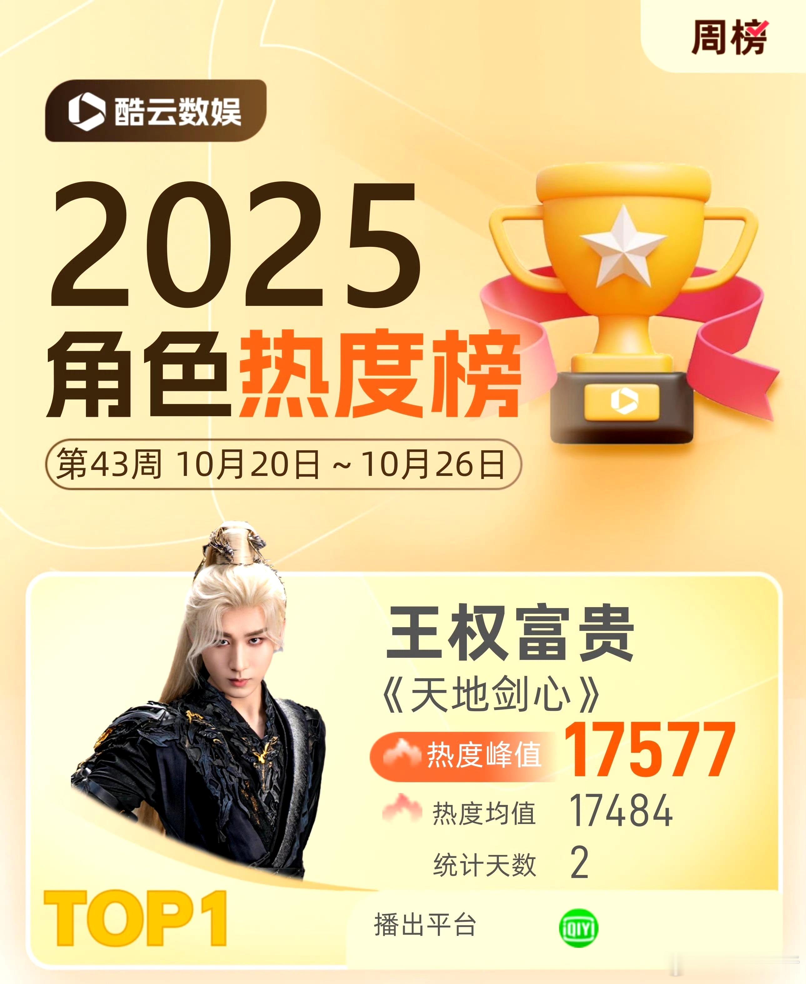 酷云角色热度周榜冠军成毅王权富贵🐮天地剑心才播2天,成毅太牛了!